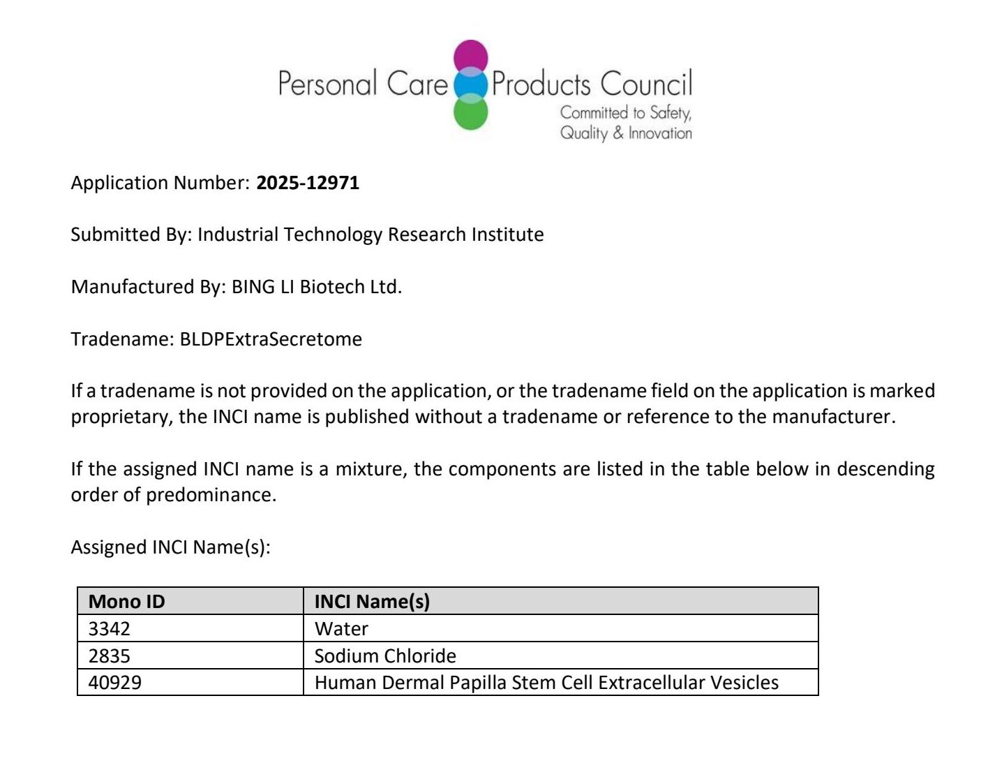 秉秝生醫(BING LI Biotech Ltd.)宣布,其以人類真皮乳突幹細胞為來源所開發的衍生物 ExtraSecretome,在今年 6 月送審國際化妝品命名委員會(INCI Committee)後,於 11 月正式完成登錄,收錄於美國化妝品個人護理品與香氛協會(PCPC)所發布的《國際化妝品原料字典與手冊》INCI Monograph ID 為 40929。這也使秉秝生醫成為台灣首家以「人類真皮乳突幹細胞衍生物」成功獲得 INCI 成分名稱登錄的企業。