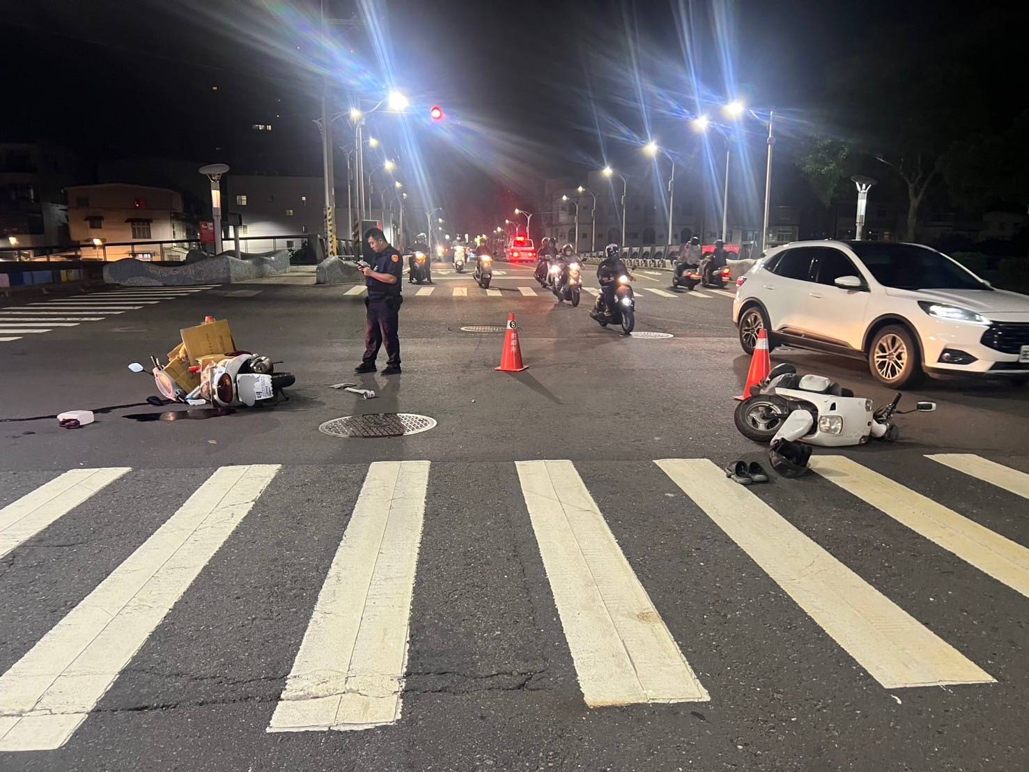 【記者廖銘瑞/高雄報導】 岡山分局於昨(22)日21時9分獲報,高雄市岡山區公園西路與阿公店路二段路口發生兩部重機車碰撞事故。員警立即到場管制交通並協助救護。