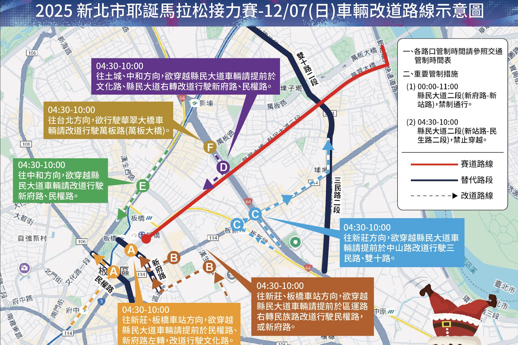 年度最具節慶氛圍的運動盛事「2025新北市耶誕馬拉松接力賽」將於 12月7日(星期日)清晨登場,今年邁入第二屆,共吸引550隊齊聚新北市民廣場開跑。賽事自凌晨5時30分從新北市政府前市民廣場鳴槍出發,路線途經縣民大道、華翠大橋,並延伸至河濱公園,全長約 24.7公里。為確保賽事順利進行與參賽選手安全,新北市政府將於活動當天對部分路段實施交通管制,提醒民眾提早規劃行程,避開賽道周邊路段。