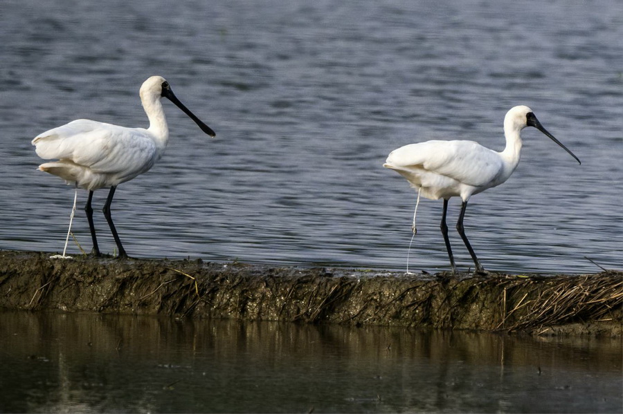 ▲兩隻黑琵不約而同的拉出排泄物。(圖/吳楊欽攝)