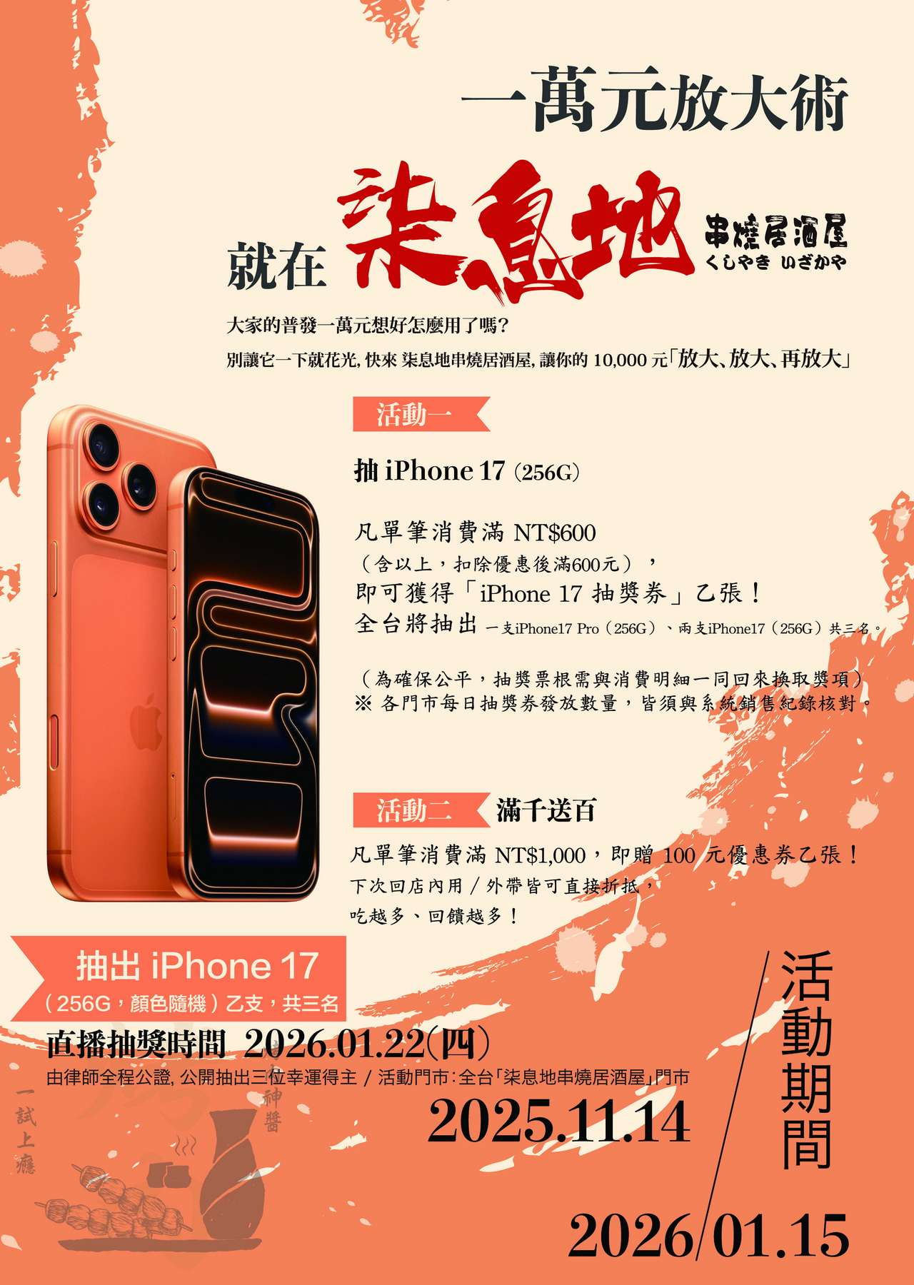 活動期間(114年11月14日至115年1月15日),凡於全台柒息地串燒居酒屋門市單筆消費滿600元(含以上、折扣後計算),即可獲得「iPhone抽獎券」乙張。