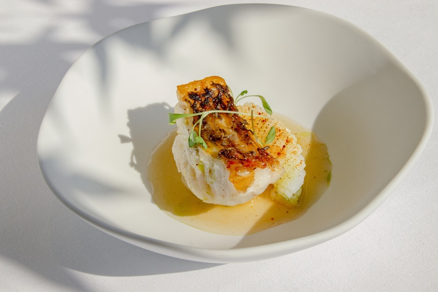 ▲本季亮點將經典台式魷魚螺肉蒜轉化為「季節鮮魚佐魷魚螺肉蒜」,以豬大骨高湯慢煮蝦米、菜脯與螺肉,搭配香煎當令鮮魚,保留熟悉台味並以法式手法提升風味層次。(圖/北投麗禧提供)