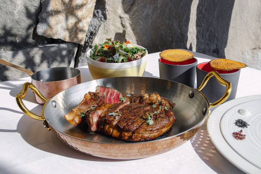 ▲雙人主餐「雲林安格斯黑牛肋眼牛排」選用雲林牧場直送,肉質軟嫩純淨,經典煎烤並靜置後鎖住香氣,呈現濃郁且純粹的風味。(圖/北投麗禧提供)