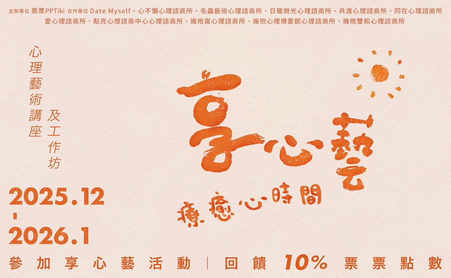 近期,票券平台「票票 (PPTiki)」主辦的心理療癒系列活動《享心藝》(連結https://pptiki.com) 受到不少討論。緊接在11月21日的「台灣諮商心理師節」後,創辦人林昱芳心理師接續邀請 15 位專業心理師與療癒專業者共同策劃,內容涵蓋 藝術體驗、書寫療癒、芳療、沙盤、園藝、瑜珈 等形式,活動將於 2025 年底至 2026 年初,在台北、新北與桃園多處心理諮商所同步展開。