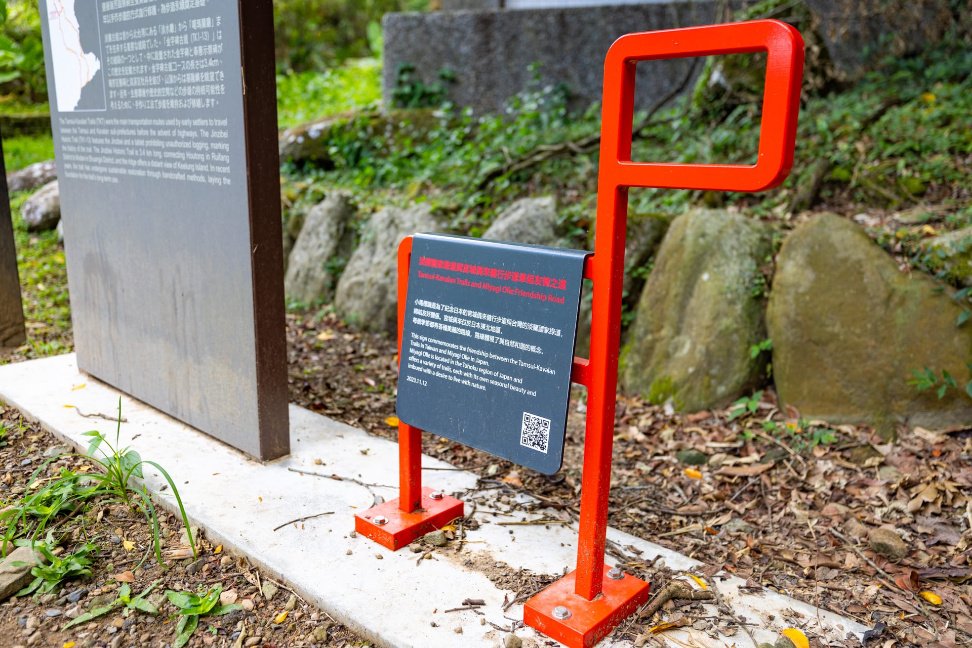 ▲金字碑古道登山口的紅色「偶來小馬」是淡蘭古道與日本宮城偶來步道友好結盟的見證