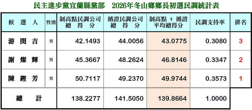 民進黨冬山鄉長初選民調結果一覽表。(資料來源/民進黨宜蘭縣黨部)