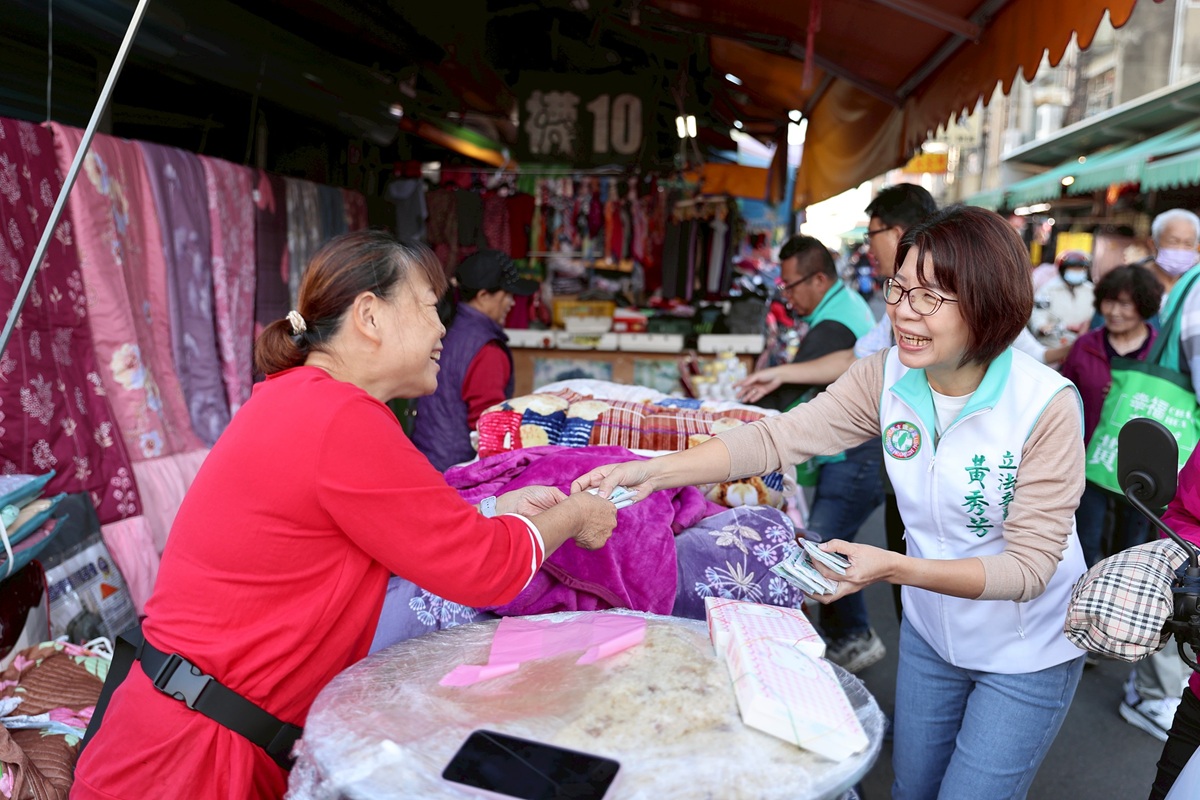 ▲黃秀芳把握問政空檔,由芬園鄉長林世明等人陪同,在芬園鄉社口市場拜票。(圖/黃秀芳競辦提供)