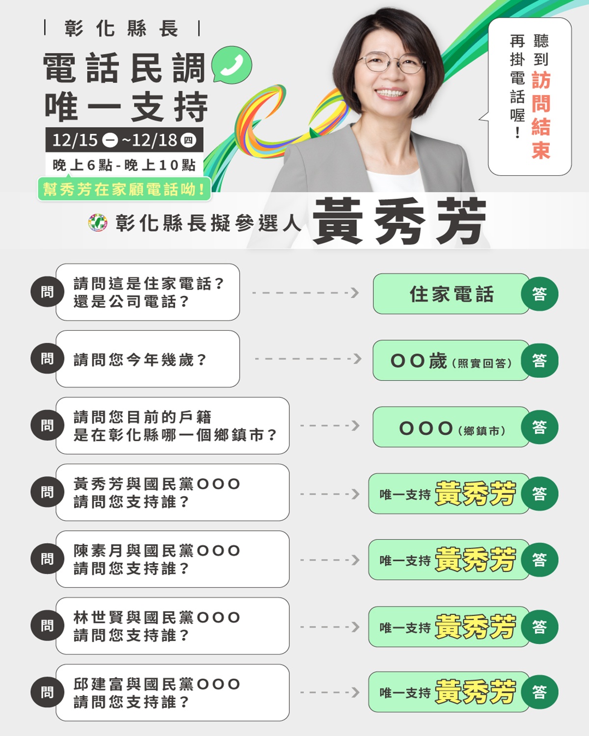 黃秀芳說,今天下午前往溪湖鎮黃昏市場拜票,團隊也同步在田中、和美、二林、北斗、鹿港、花壇、員林等地拜票,訴求「電話民調唯一支持黃秀芳」,因為縣民較少接觸初選電話民調,因此也特別製作圖卡說明電話民調規則。