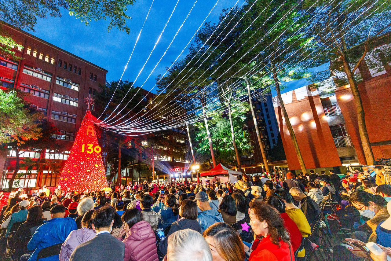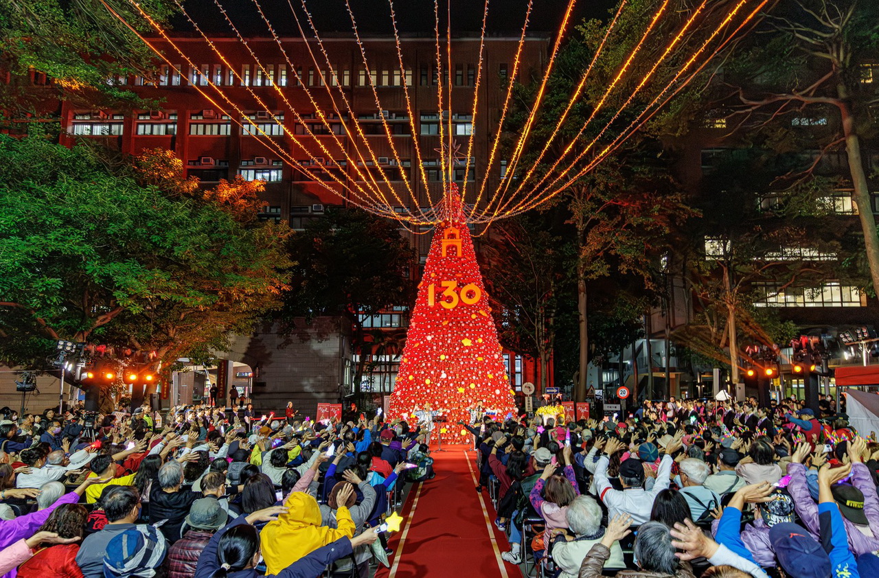 你看過全紅的聖誕樹嗎?國北教大27日舉辦「130向前走」校慶點燈祈福典禮,是國北教大及校友總會、億光文化基金會主辦,結合「雙春金蛇年」意涵,用5000多顆金銀紅聖誕球妝點,在絢麗天幕光影折射的璀璨燈海下展開,吸引上千師生及各界貴賓同來祝賀,成為歲末最夯最飆的浪漫風情!