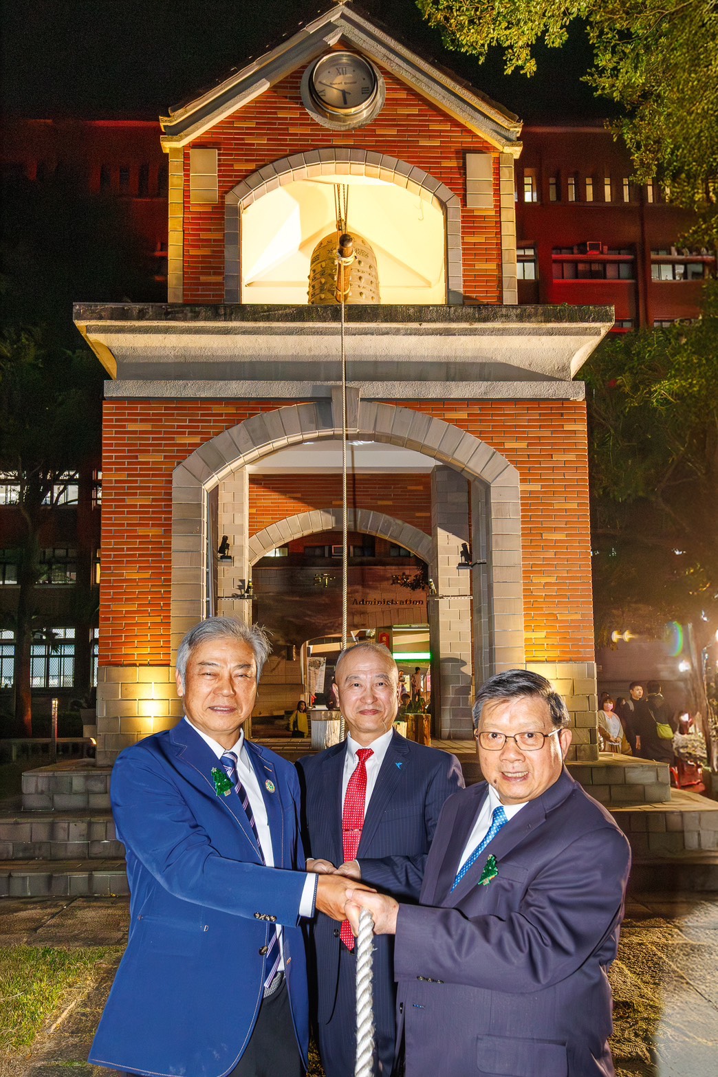 ▲陳慶和校長、粘舜權理事長與葉寅夫董事長一同敲響象徵祝福與希望的和平鐘。(圖/億光文化基金會提供)