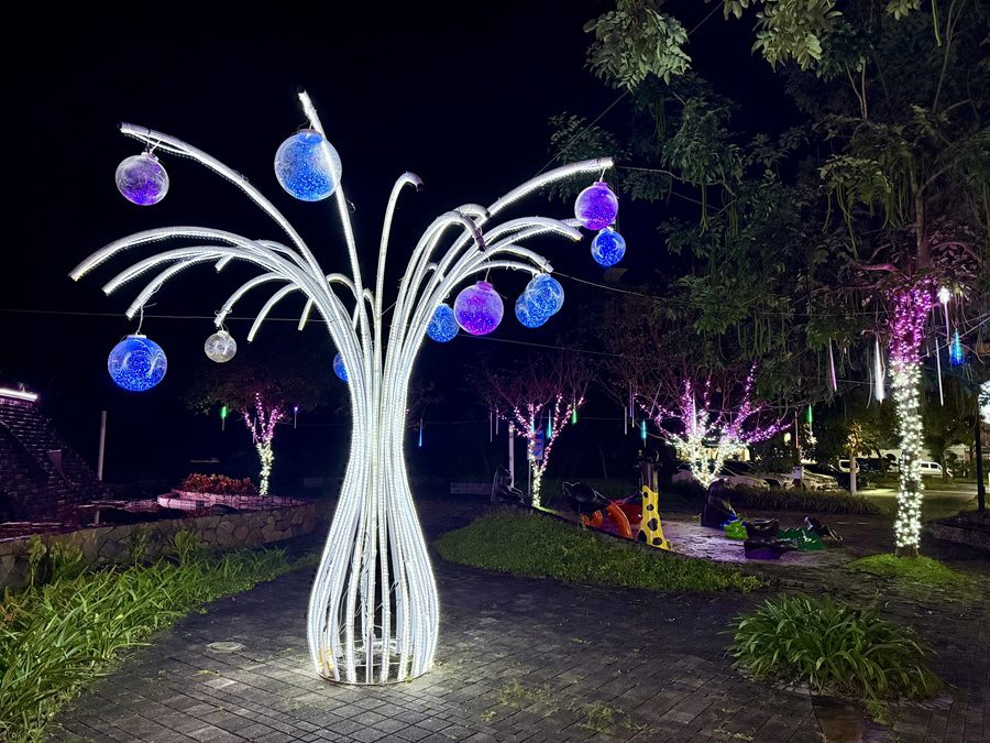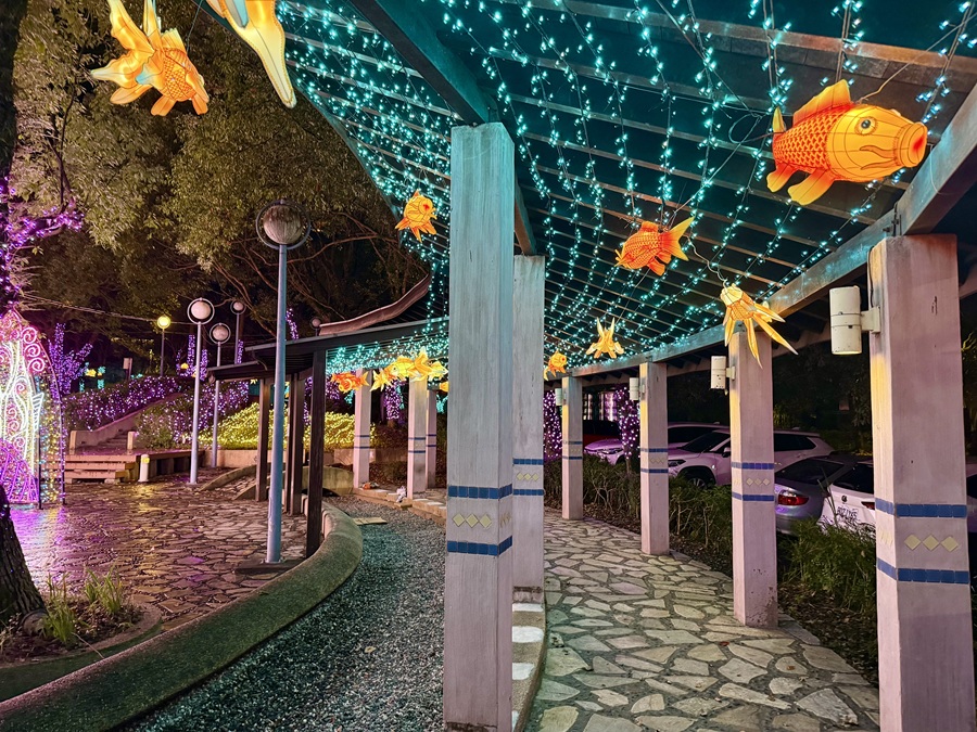 今年的主燈「泉華共舞」位於溫泉廣場,高達五米,以溫泉孕育的靈魂為概念核心,結合巴洛克式線條與中央孤挺花造型,將水流律動化為光影層次。主燈周邊以溫泉湯意象打造休憩區,柔藍光景與溫泉魚花燈交相輝映,營造兼具生命力與藝術性的沉浸空間。步道部分則以永續自然為靈感,運用樹枝燈片勾勒出交錯光影,宛如自然脈絡在夜裡緩緩流動。
