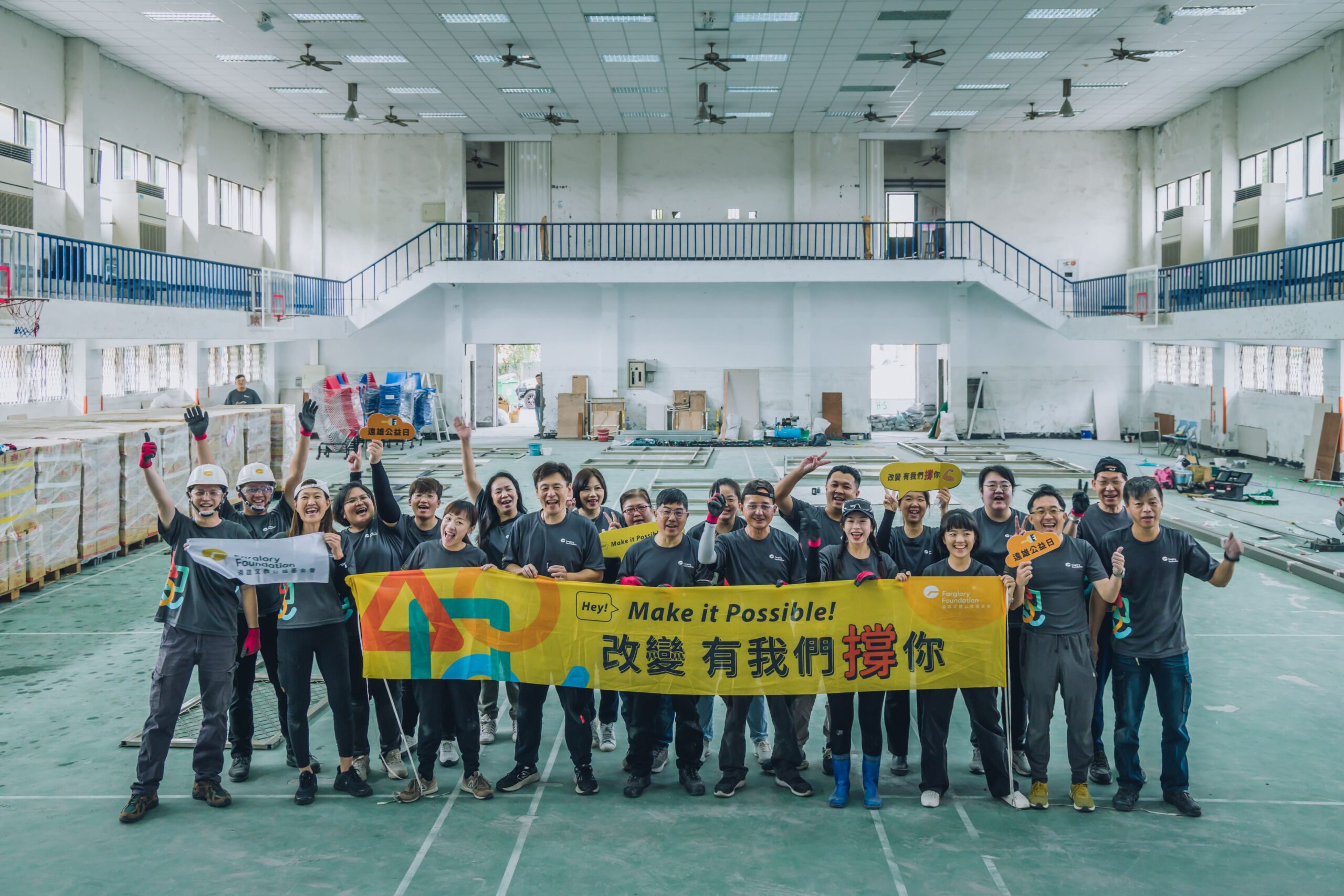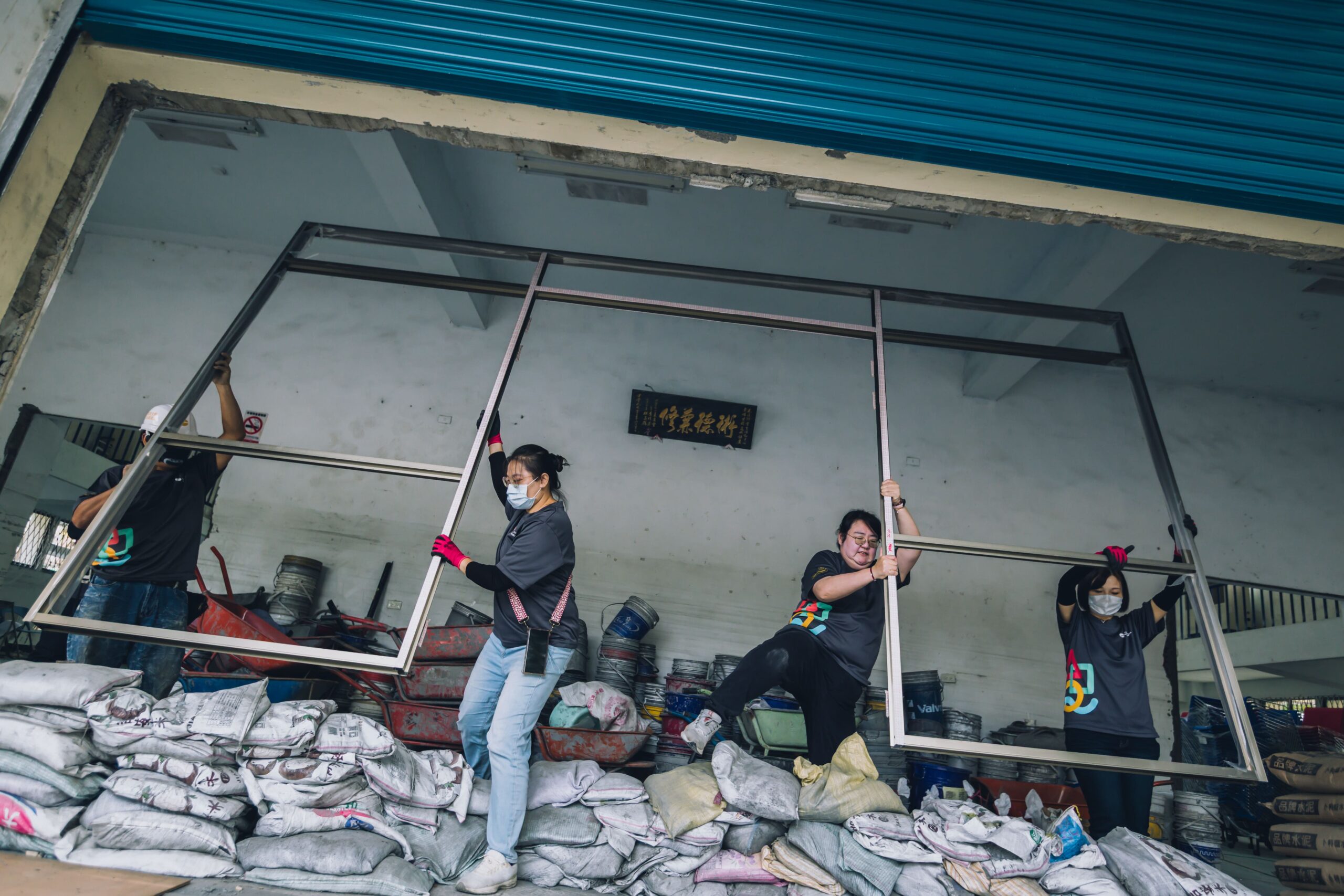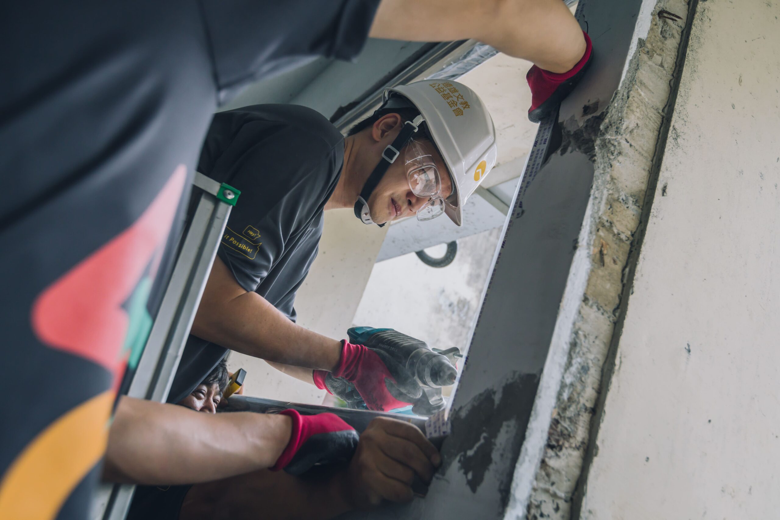 遠雄志工抵達現場後立即依專業分工,分別投入氣窗、鋁門等修復工程,其中氣窗小隊志工們再兵分二路,針對左右兩側的12面氣窗組裝、封版。考量到氣窗位置較低,足球隊在訓練時常會將球踢出室外,此次施工以矽酸鈣板搭配木板封住氣窗,兼具使用安全與實際需求。另一頭負責鋁門框組裝的志工,先將門框周邊突出的鋼筋與混凝土修整填補,再仔細量測水平與垂直角度安裝門框。許多志工分享,一聽到基金會號召公益修繕,都是立刻協調班表,深怕錯過此次公益任務。遠雄遊憩休閒事業總監鄧淳仁分享:「災情發生當下,就已與遠雄海洋公園的同仁立刻趕往光復鄉,加入『鏟子超人』行列,也協助民宅清淤與物資搬運。這回再參與基金會的公益修繕,希望透過實際行動,持續為花蓮地方盡一份心力,也讓孩子們的學習環境儘快恢復正常。」
