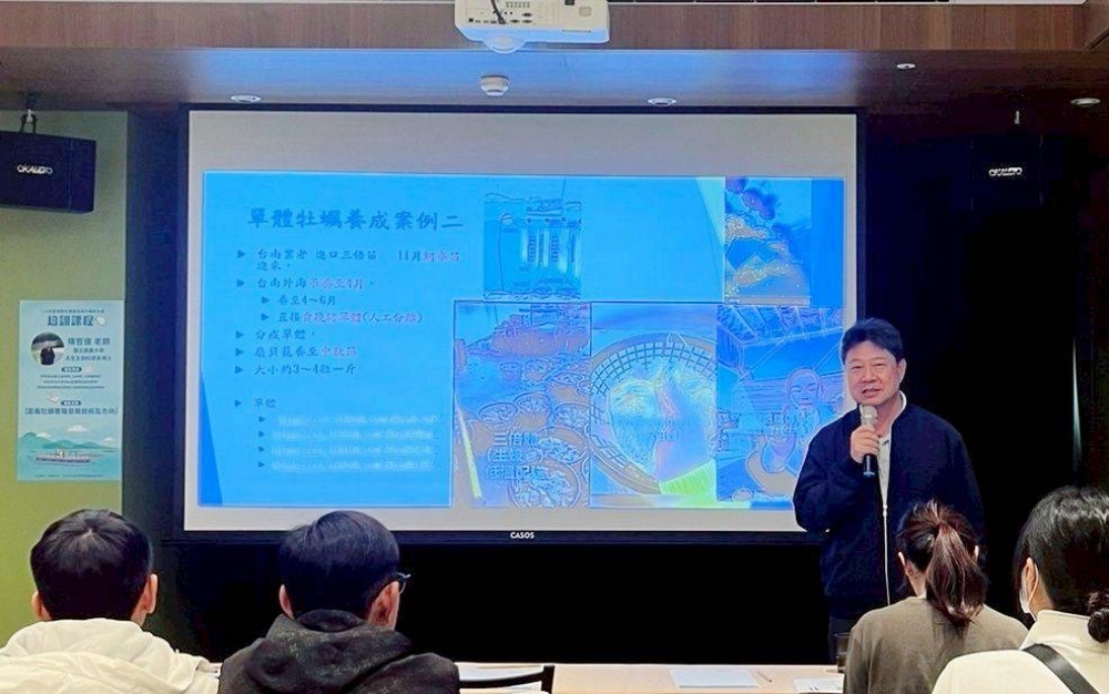 「牡蠣養殖技術發展與展望」課程,由嘉義大學陳哲俊教授講授,陳教授長年從事水產養殖領域研究及實務,深受蚵農信賴,他以國內外牡蠣養殖技術及市場趨勢為基礎,解析單體牡蠣、牡蠣串、生蠔等不同類型的養殖方式及市場需求,並分享人工苗、三倍體牡蠣等趨勢,並與蚵農探討嘉義牡蠣未來可發展的方向。