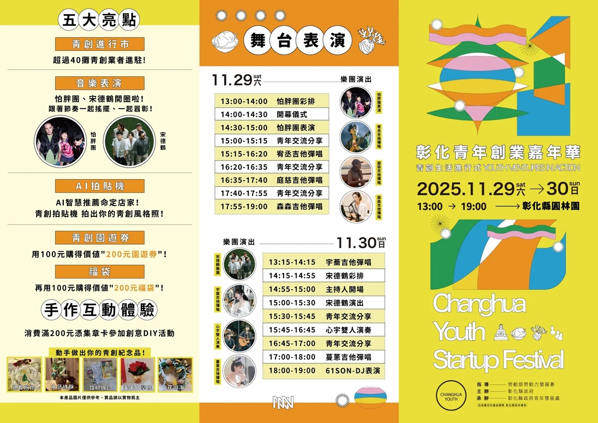 為推廣青年創業輔導成果,建立青創交流平台與展銷機會,彰化縣政府於11月29、30日在彰化縣圓林園舉辦為期兩天的「114年彰化青年創業嘉年華」活動,縣長王惠美出席開幕儀式,與民眾一起目睹在地青年的創業成果。王縣長表示,縣府為協助青年留鄉、返鄉,每年編列1,000萬元的經費,提供最高30萬元的創業圓夢補助,目前已補助136位青年自己創業做頭家。也建立輔導創業機制,提供一年最多5次的專業服務,協助青年處理實體店面,或電商領域的規劃等等各方面問題。