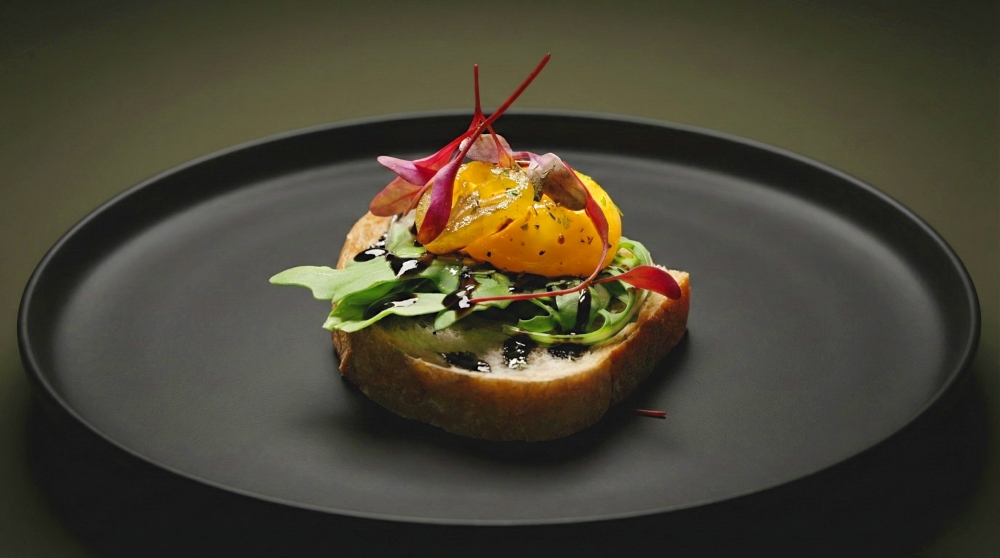 ▲【酸種麵包・油封蛋黃・芝麻葉・牛血葉】主廚以酸種麵包為底,包覆油封蛋黃的濃郁與滑順,搭配芝麻葉與牛血葉,創造出苦韻與溫潤交織的風味,展現充滿現代感的前菜。(圖/業者提供)