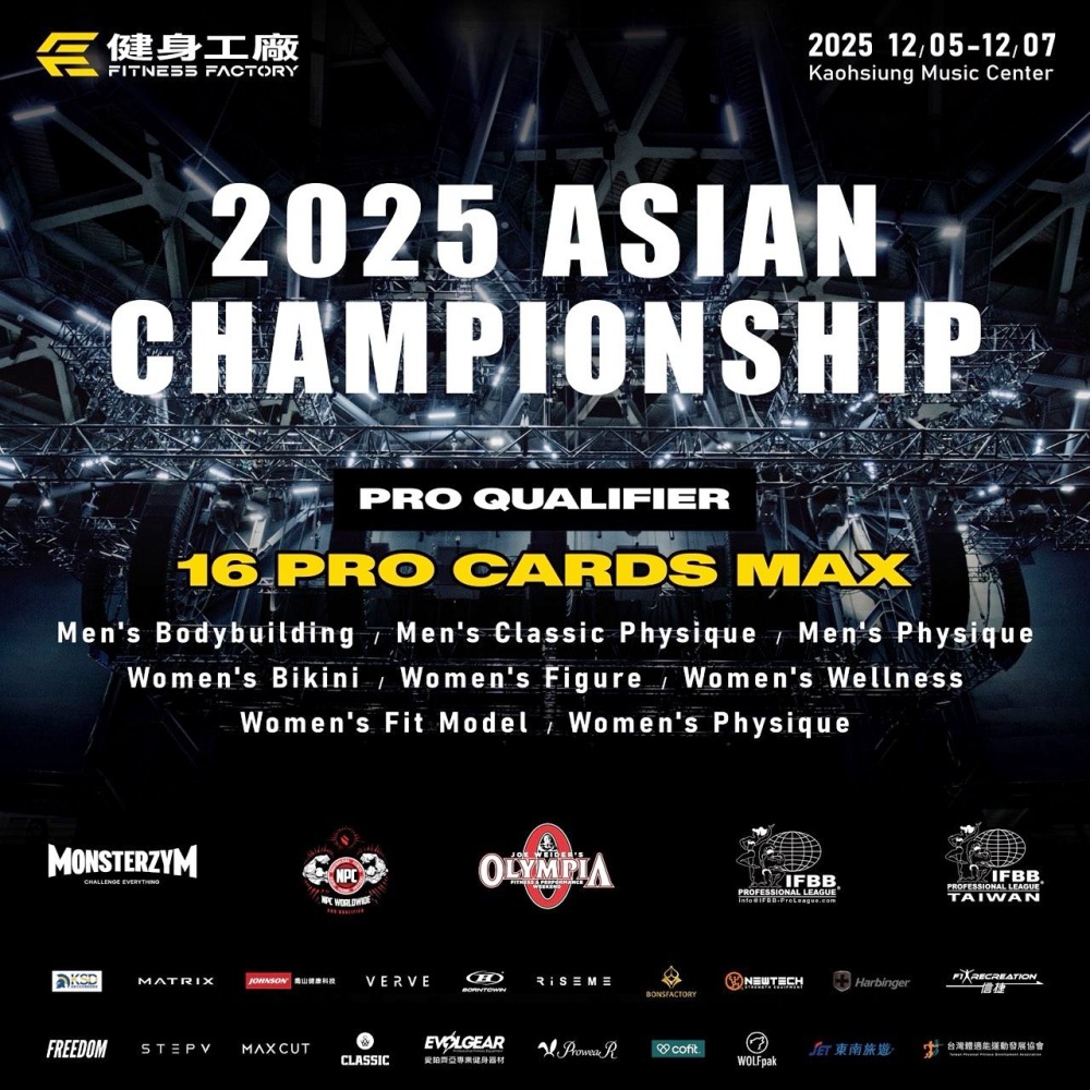 2025年亞洲最受矚目的指標性健美賽事— 《IFBB PRO/NPC WORLDWIDE 亞洲健美錦標賽》(Asian Championship)將於12月5日至7日隆重登場,首次在台灣舉辦,以亞洲最大規模、最強陣容之姿,寫下台灣健美史全新里程碑。其中亞洲健美錦標賽由韓國 Monsterzym、IFBB PRO League Taiwan 與健身工廠Fitness Factory共同主辦,並由IFBB PRO LEAGUE直接授權,是亞洲等級最高、選手最重視的官方殿堂級賽事。2025賽事亦是亞錦賽第二度於亞洲舉行,更是首次進軍台灣,意義非凡。此次賽事亮點,包括職業賽包含212 Bodybuilding、Classic Physique、Men’s Physique、Bikini、Women’s Physique,以及台灣首次舉辦職業組Wellness這6大項目,而業餘賽則是包含傳統健美、古典健美、健體、比基尼、女子形體、健康體態、健身模特兒、女子形體8大項目,本屆將頒發最多16張職業卡(業餘組每項目最多2張),吸引超過20國、逾120位以上精英選手參戰,為亞錦賽歷年規模最大的一屆。