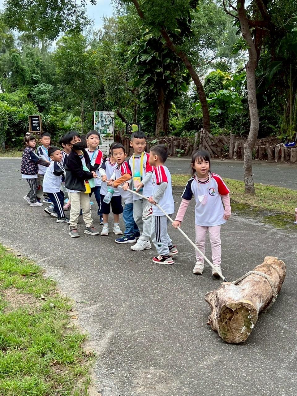 ▲學童體驗「甲蟲力氣大」的趣味,合力拉動大木頭。