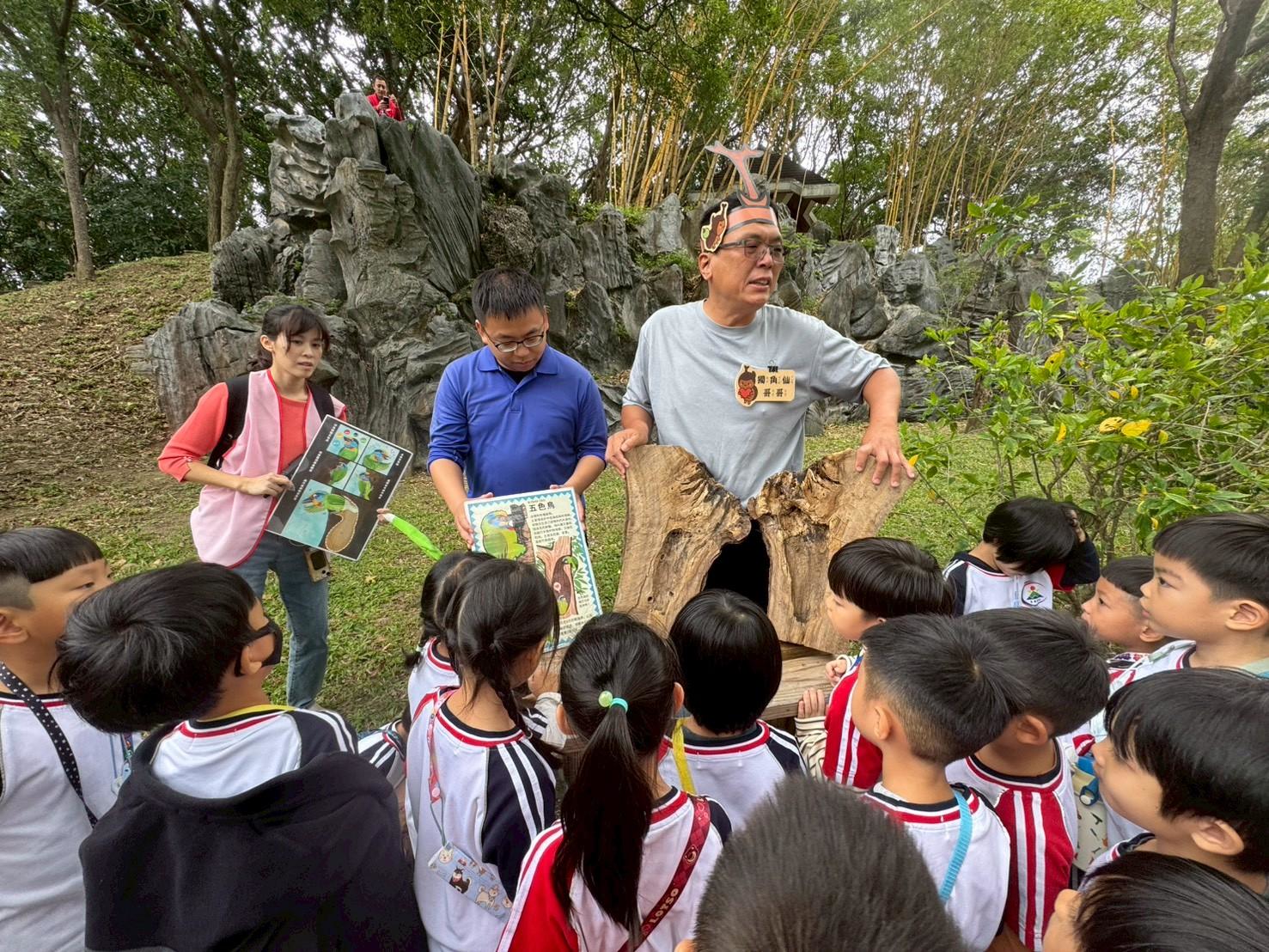 附幼森林班老師黃珠娟與馮宜華帶領幼兒們與志工家長與美侖獨角仙哥哥~園藝部主任黃勝裕相見歡,由他導覽解說,陪伴孩子們以五感親近自然,內容豐富、環節連貫,讓幼兒在遊戲式探索中,學習植物、生態與環境知識。