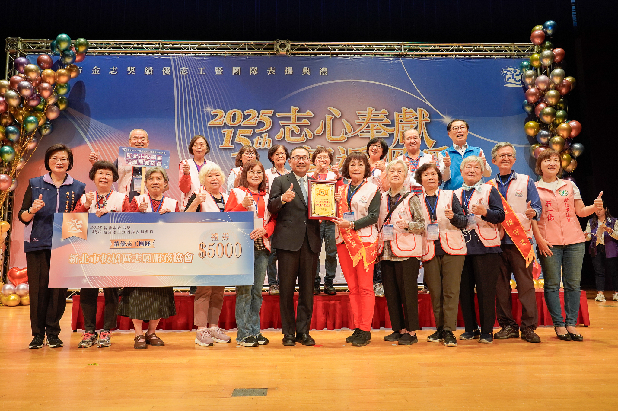新北市2日上午在3樓多功能集會廳表揚第15屆金志獎,共有8個志工團隊、50位志工、56位耆心獎(高齡志工)及5位志工督導獲獎。市長侯友宜表示,志工是守候新北市這座404萬人口城市最溫暖的力量,讓社會更祥和。他也鼓勵男性多走來參與志願服務,身體會更健康、更長壽,以免老待在家裡變成「老孤孓」。
