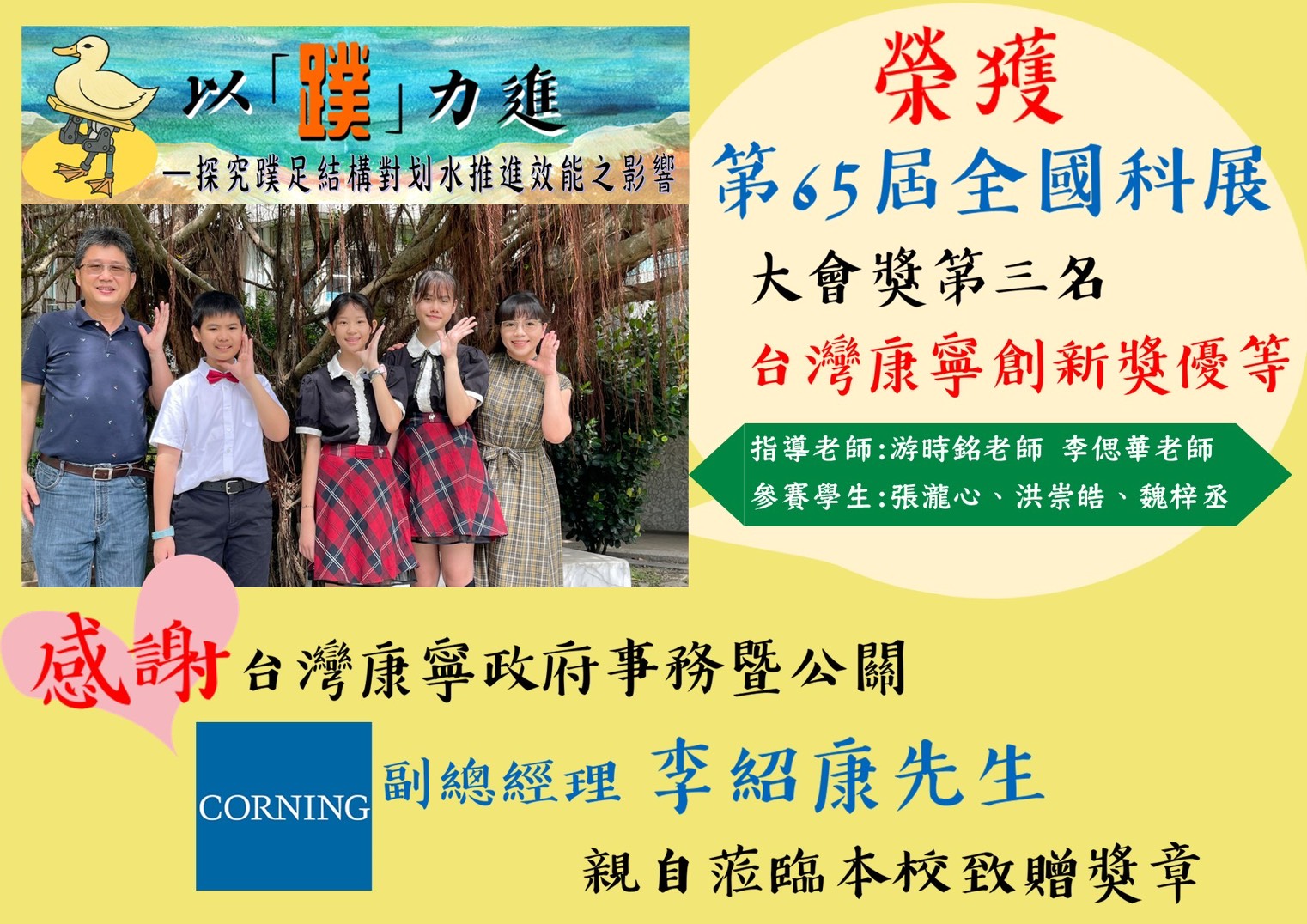 國立東華附小以作品 「以『蹼』力進─探究蹼足結構對划水推進效能之影響」,在今年第 65 屆全國中小學科學展覽會,榮獲全國大會獎第三名,並獲得由台灣康寧設立的 「台灣康寧創新獎」優等獎殊榮。台灣康寧政府事務暨公關副總經理李紹康今(3)日在學生朝會中,頒發專屬金屬獎章給同學與指導老師,以表達對創新與科學教育的支持。