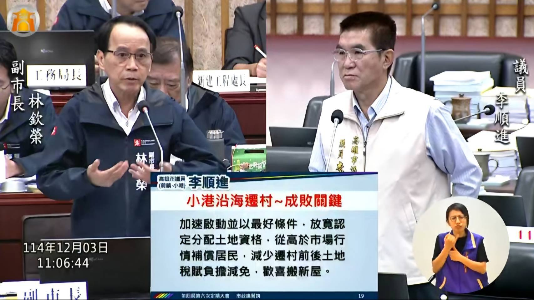 大林蒲遷村是本次質詢中最受矚目的議題之一。李順進表示,明年將進行協議價購說明會,但真正影響成功與否的關鍵在於「速度與補償」。他呼籲市府: