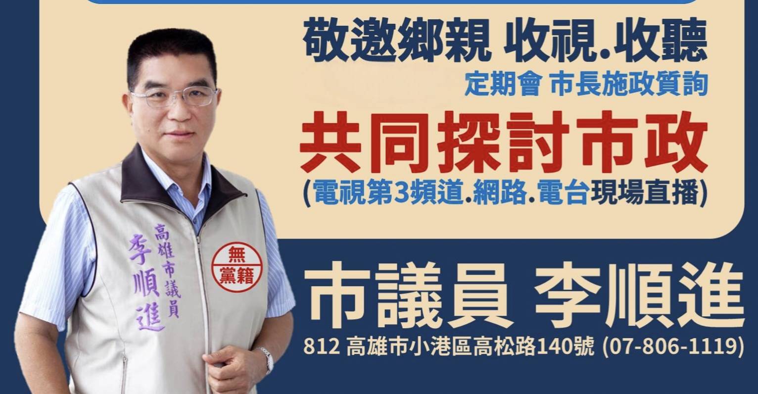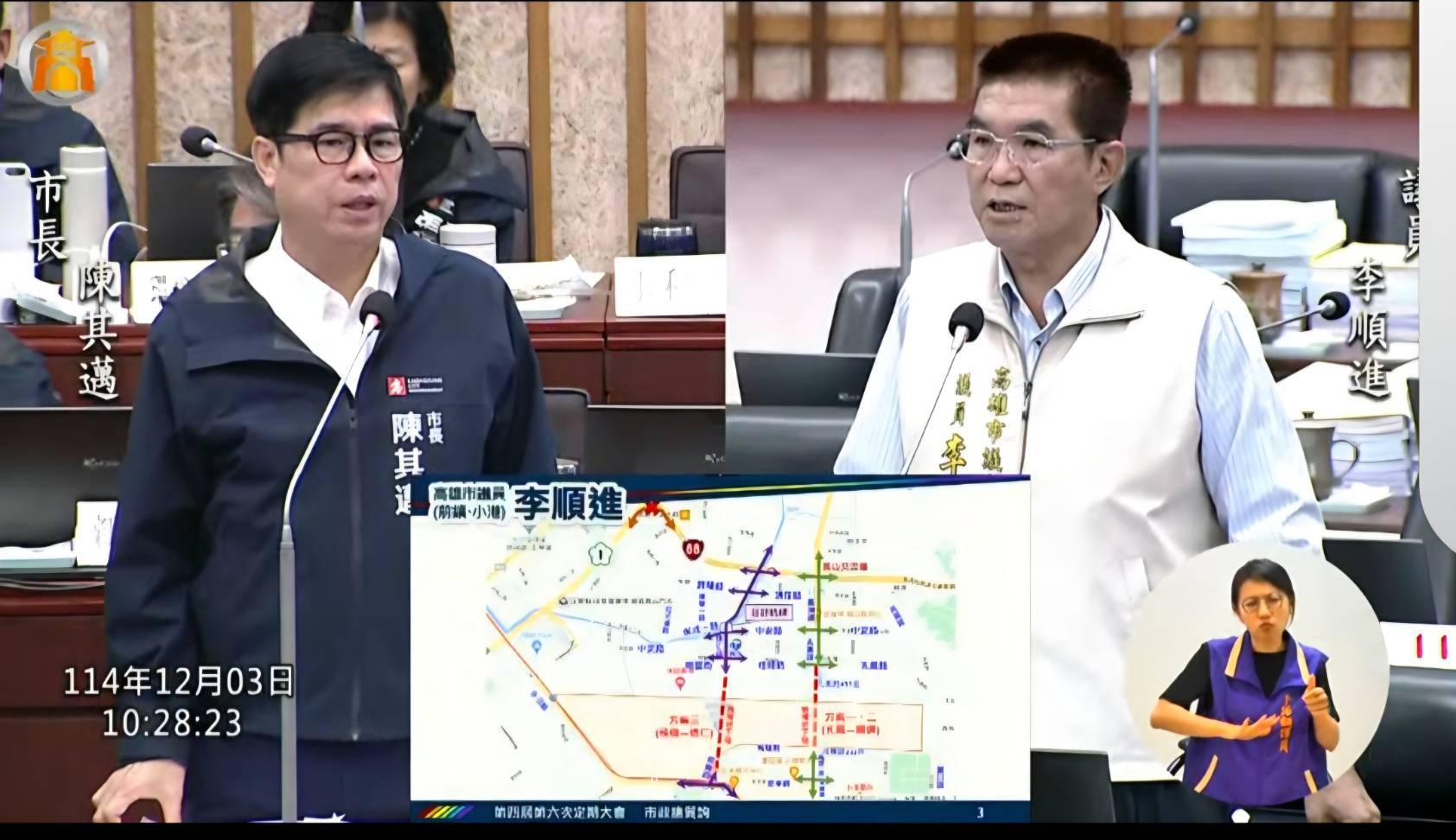 【記者 周志杰/高雄報導】高雄市議員李順進今(12/3)在市政總質詢中,以「環境、安全、交通、產業」四大主軸為焦點,全面檢視小港、前鎮與沿海城鄉發展。他直言國道 7 號、南星機場、捷運建設、公設用地開發與大林蒲遷村等項目牽動南高雄未來十年城市格局,呼籲市府加速決策、提高補償並強化跨局處協作。市長陳其邁多項議題皆正面回應,強調將以更積極作為改善交通瓶頸、推進重大建設並兼顧居民權益。