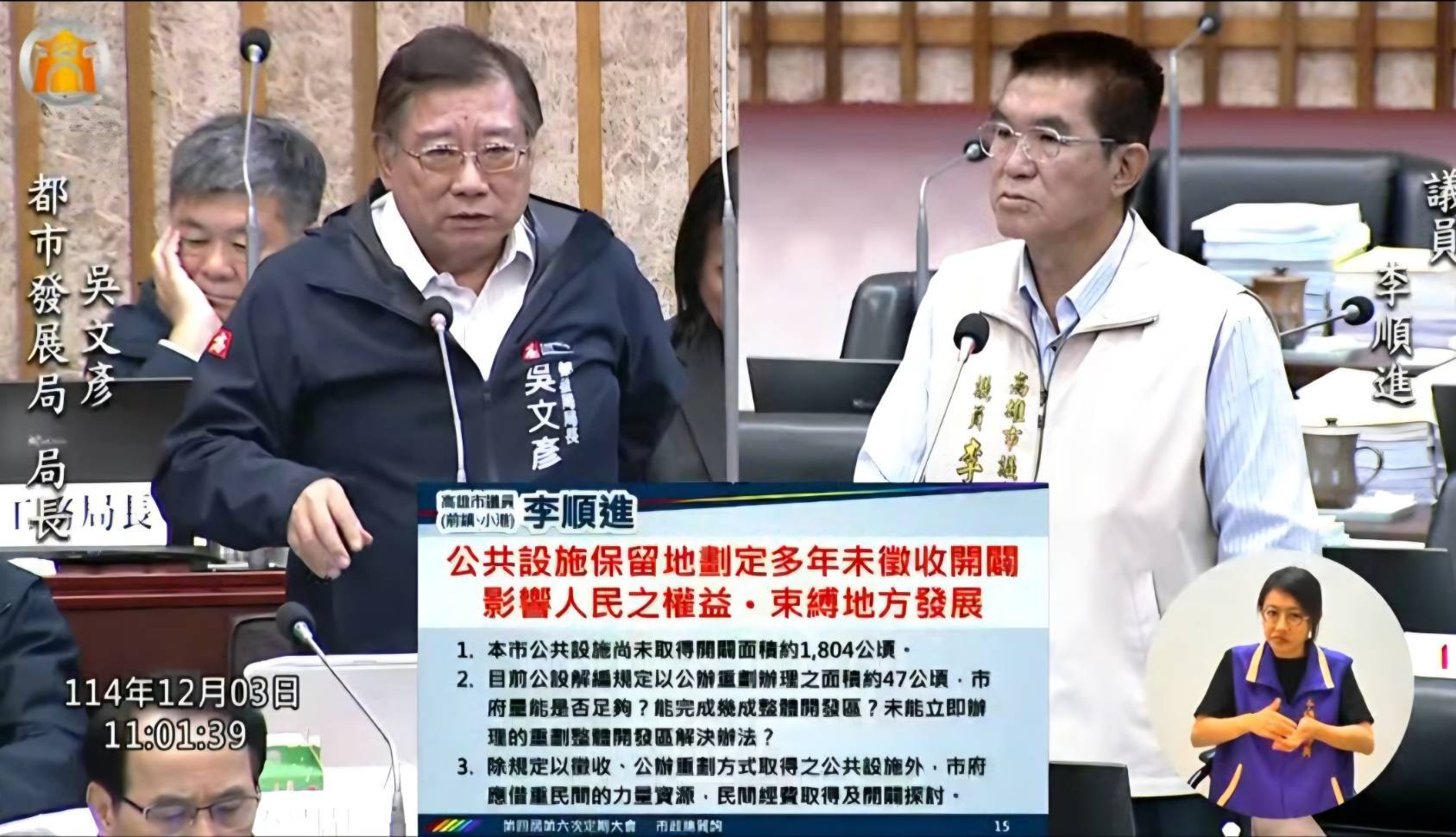 都發局長吳文彥表示,公設取得需考量「急迫性、公益性、財政負擔」等基準,將依照評估逐案處理,但仍無法滿足議員「全面加速」的主張。另外,在停車需求方面,李順進指出捷運運量提升代表城市發展良好,但停車位明顯不足,建議在前鎮民權花市、崗山仔、小港飛機及桂林飛機等四座公園增建地下停車場,以公私協力方式推動,打造三贏模式。