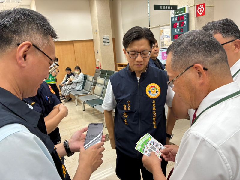 東港分局推動「打詐一點通-QR Code報案」,除製作海報張貼於提款機附近外供民眾使用,更貼心製作小卡片提供行庫及超商張貼於櫃檯內,便利行員及超商櫃檯人員不用出聲,只要一掃碼發送,警方就會立即派員前往查緝。