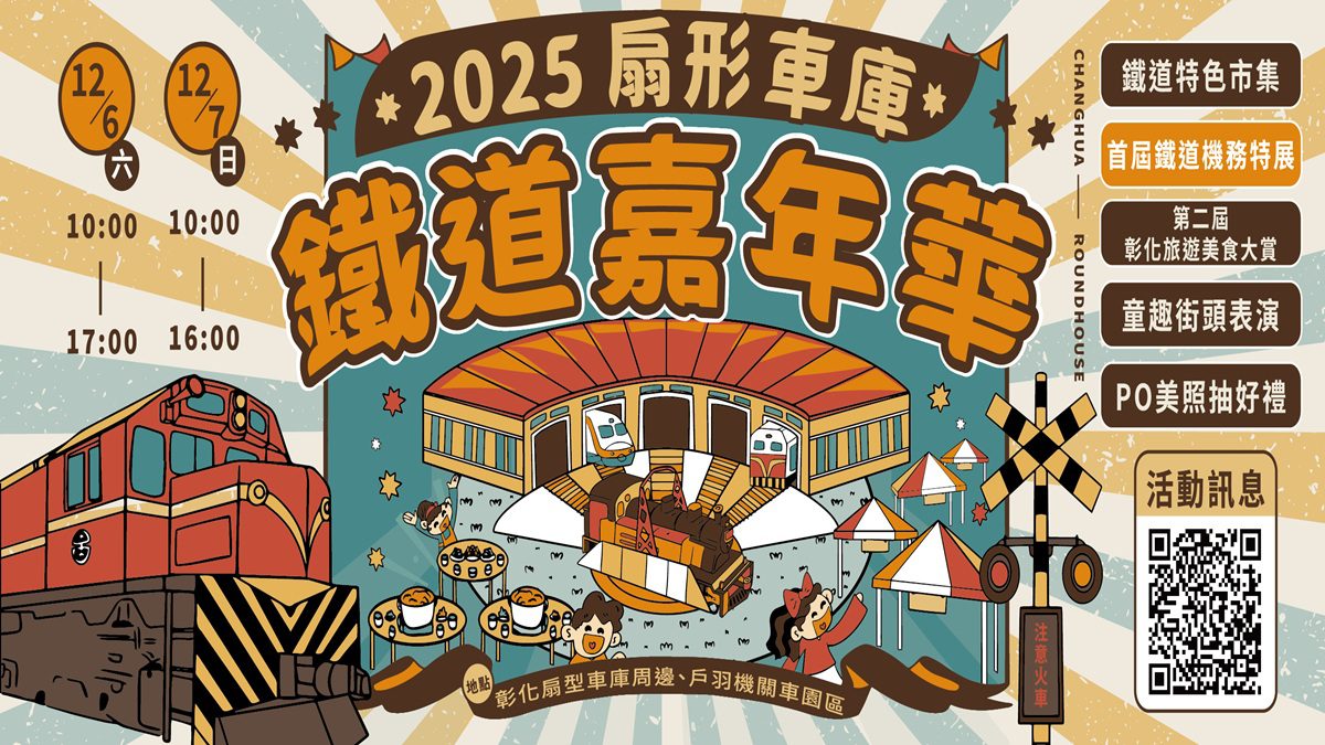 參山處強調,扇形車庫不僅是彰化的文化象徵,更是推動永續旅遊的重要節點。本次鐵道嘉年華希望透過園區「空間重塑」及「視覺調整」,除視覺衝擊外,也帶給民眾兼具文化深度與旅行樂趣的全新體驗。參山處誠摯邀請全國民眾,本週末到彰化拍火車、吃美食、逛市集、抽好禮,感受百年扇庫與城市新樣貌交織出的冬季旅遊魅力。
