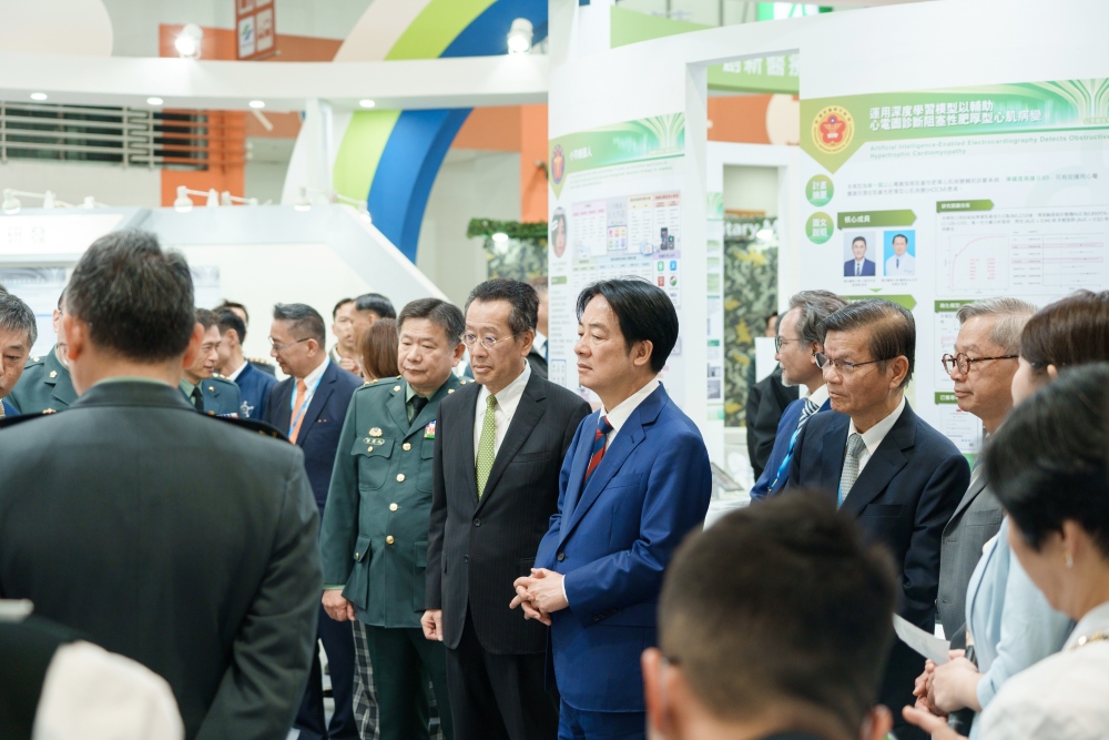 中午總統賴清德由生策會翁啟惠會長、國科會吳誠文主委、衛福部林靜儀次長等陪同蒞臨國軍醫療體系展區,對國軍醫療科技發展高度重視與支持,海軍常務次長黃中將、軍醫局局長蔡中將及政務辦公室主任孫中將帶領軍醫同仁歡迎與合影,並介紹「生物致病原檢測晶片及微流體晶片測定儀」,彰顯國軍在醫療科技與軍陣醫學發展上的卓越成果。