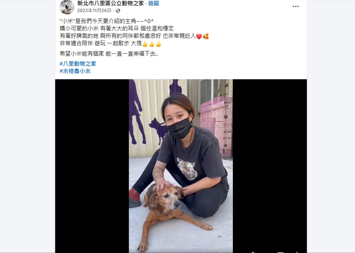 動保處所屬八里動物之家的「小米」是一隻混種米克斯,約莫3年前在新莊區街頭遊蕩被民眾通報入所,八里動保員陳姮蓉表示,「小米」有點混血米格魯,有一對大大的耳朵,體型嬌小,有點圓潤可愛,雖然有點年紀,但個性穩定非常親人也親狗,常常會默默地坐在我們身邊,是一位非常優質的「傾聽者」。「小米」也在日前新莊區IKEA認養會找到新主人,認養人楊小姐表示,因為想要找一隻狗狗作伴,認養會前就有在關注八里動物之家官方臉書,也看過動保員介紹「小米」的影片,相當喜歡牠可愛的模樣及個性,現場實際互動後,立馬決定要認養牠!