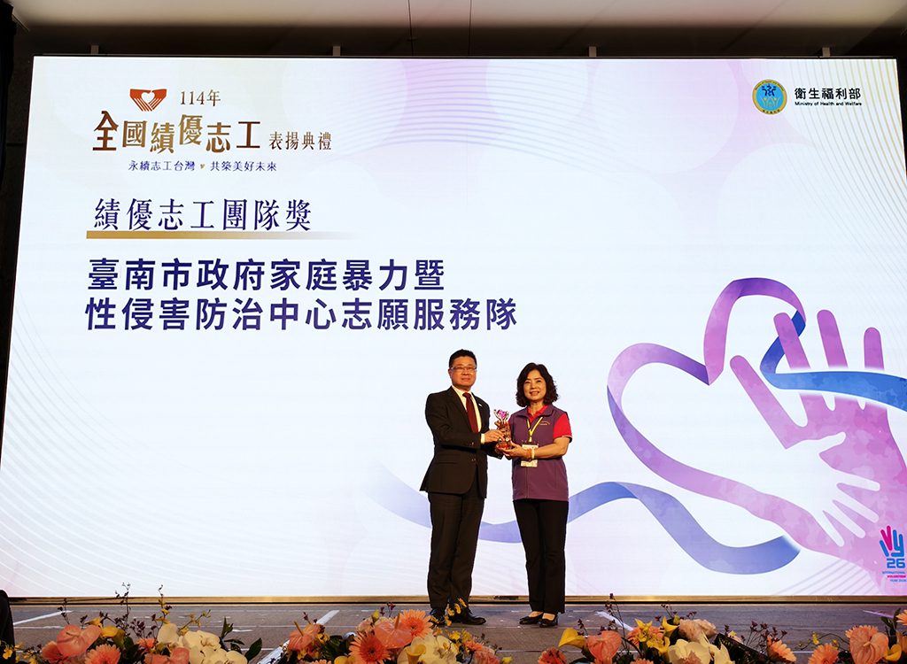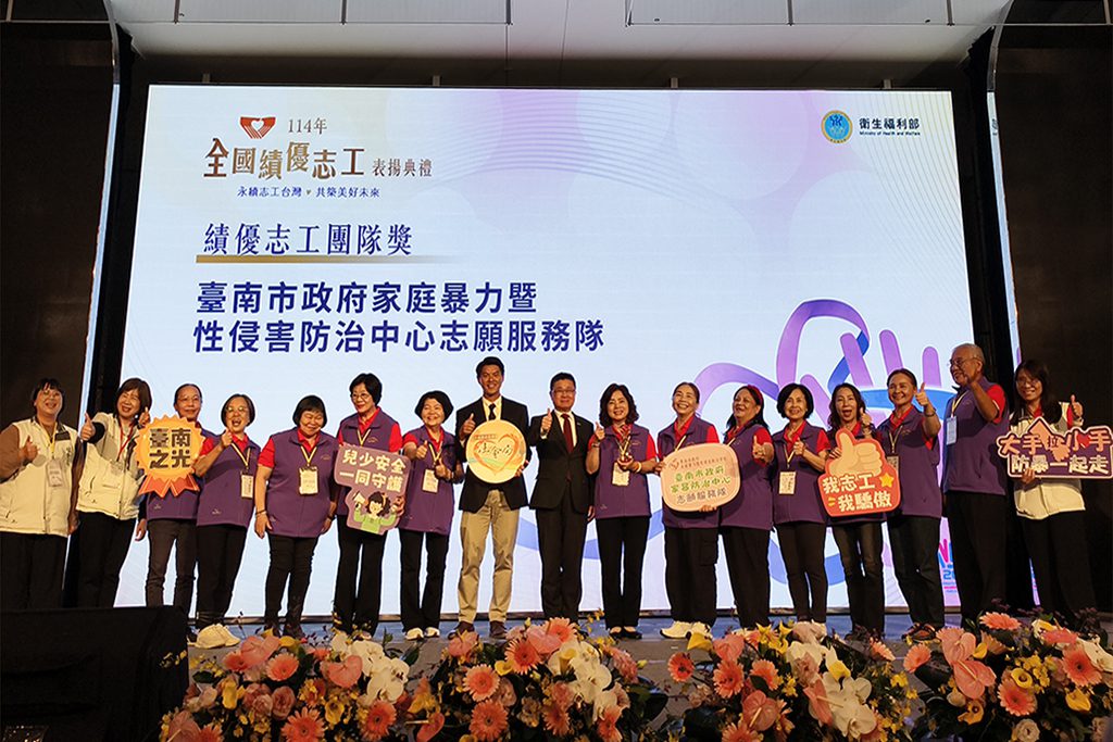 【記者吳玉惠/臺南報導】 西元1985年聯合國訂定12月5日為國際志工日(International Volunteer Day),這個節日旨在表揚志工的無私奉獻,並鼓勵更多民眾投入志願服務。衛生福利部響應此理念於11月28日假大直典華幸福大樓舉辦114年全國績優志工表揚典禮,臺南市政府家庭暴力暨性侵害防治中心志願服務隊榮獲「全國績優志工團隊獎」,由衛生福利部呂建德政務次長親自頒獎。黃偉哲市長特獻花祝賀,並由家暴防治中心楊逸宏主任代表到場,感謝志工夥伴長期協助市府投入防治工作。