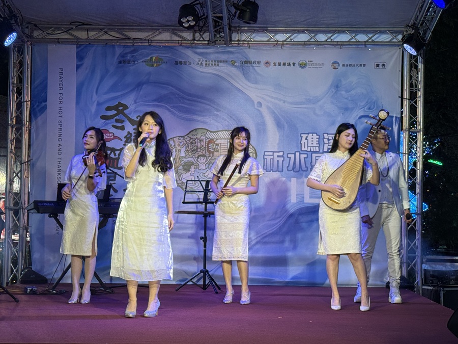 晚會特別邀請傳奇歌后潘越雲演唱《野百合也有春天》、《天天天藍》等經典歌曲,並由客家樂團HKG女子樂團輪番演出,以動人樂音烘托溫泉鄉之夜的文化情感,現場鼓聲迴盪、煙霧繚繞,引領眾人沉浸於礁溪獨特的溫泉鄉氛圍中,不僅展現產業團結的力量,更象徵著溫泉文化從感恩出發、向未來扎根的深厚底蘊。