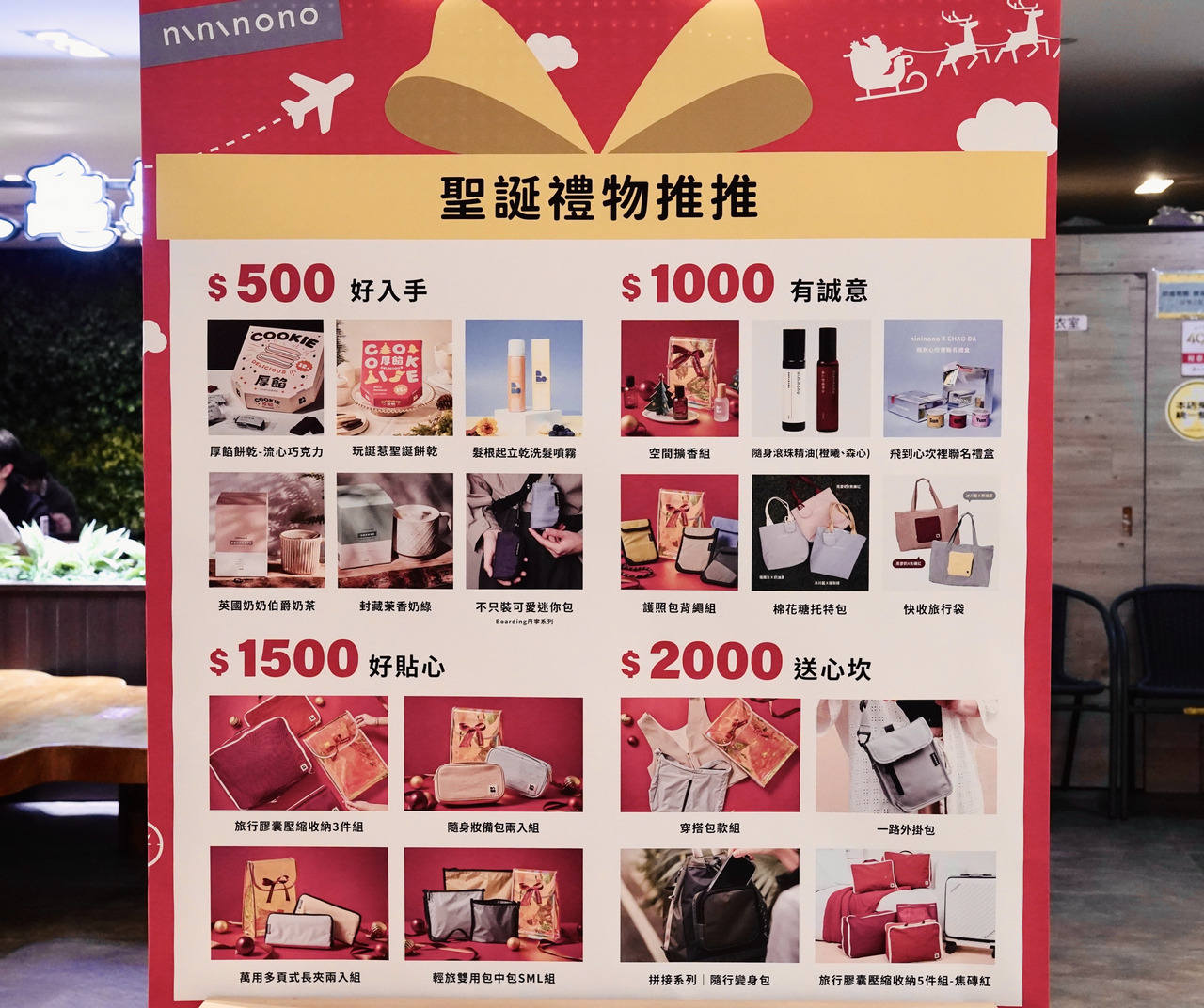 延續 nininono Air 的品牌概念,快閃店空間以機場與候機室為靈感設計,並融合聖誕紅色調,與板橋耶誕城節慶氛圍相呼應。現場展示旅行收納、萬用多頁長夾、外掛包、香氛精油與洗沐系列等旅行配件,並特別設置「交換禮物專區」,協助消費者快速找到符合預算又具質感的選項。