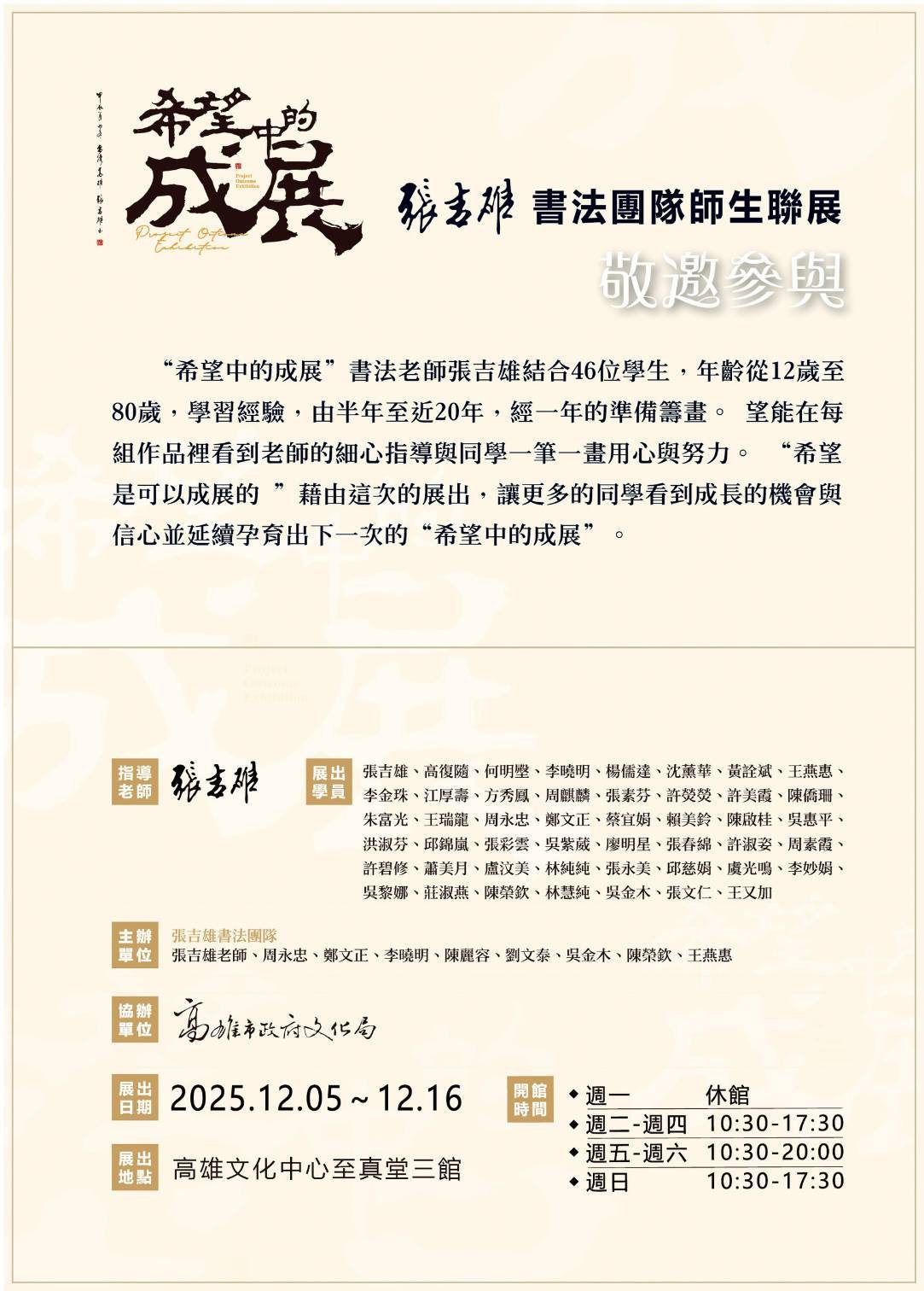 展覽終章,也是新的起筆;「希望中的成展」展期自12月5日至12月16日,透過公開展出,學員看見自身成長,也為未來累積前行的信心。主辦單位期盼,這份由筆墨凝聚的希望能持續延伸,讓更多人走入書法世界,靜心書寫人生。下一次「希望中的成展」,也已在眾人心中悄然醞釀。