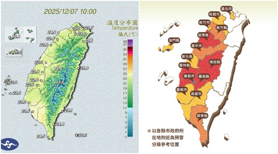 今天12月7日東北季風稍稍減弱,各地氣溫逐漸回升,但受輻射冷卻影響,早晚氣溫仍然較涼,苗栗以南日夜溫差大;臺灣各地及澎湖、金門、馬祖大多為晴到多雲的天氣,僅基隆北海岸、大臺北山區、東北部及東部地區有零星短暫雨。