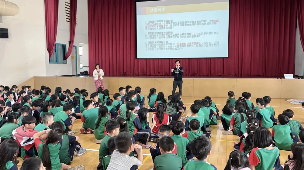 活動一開始即播放FIT星球大反擊動畫影片及柚子醫師的衛教影片,隨後陳木榮(柚子醫師)及劉影梅教授以生動案例講解方式,向孩子們解說「健康體位」的意涵,提醒均衡飲食是維持理想體態與身體機能的關鍵,並鼓勵家長與老師協助孩子減少含糖飲料、油炸食物的攝取,共同打造支持性的健康環境。劉影梅教授則以簡明的方式介紹運動對智力與情緒發展的助益,鼓勵孩子每天至少運動一小時,讓身心保持最佳狀態。
