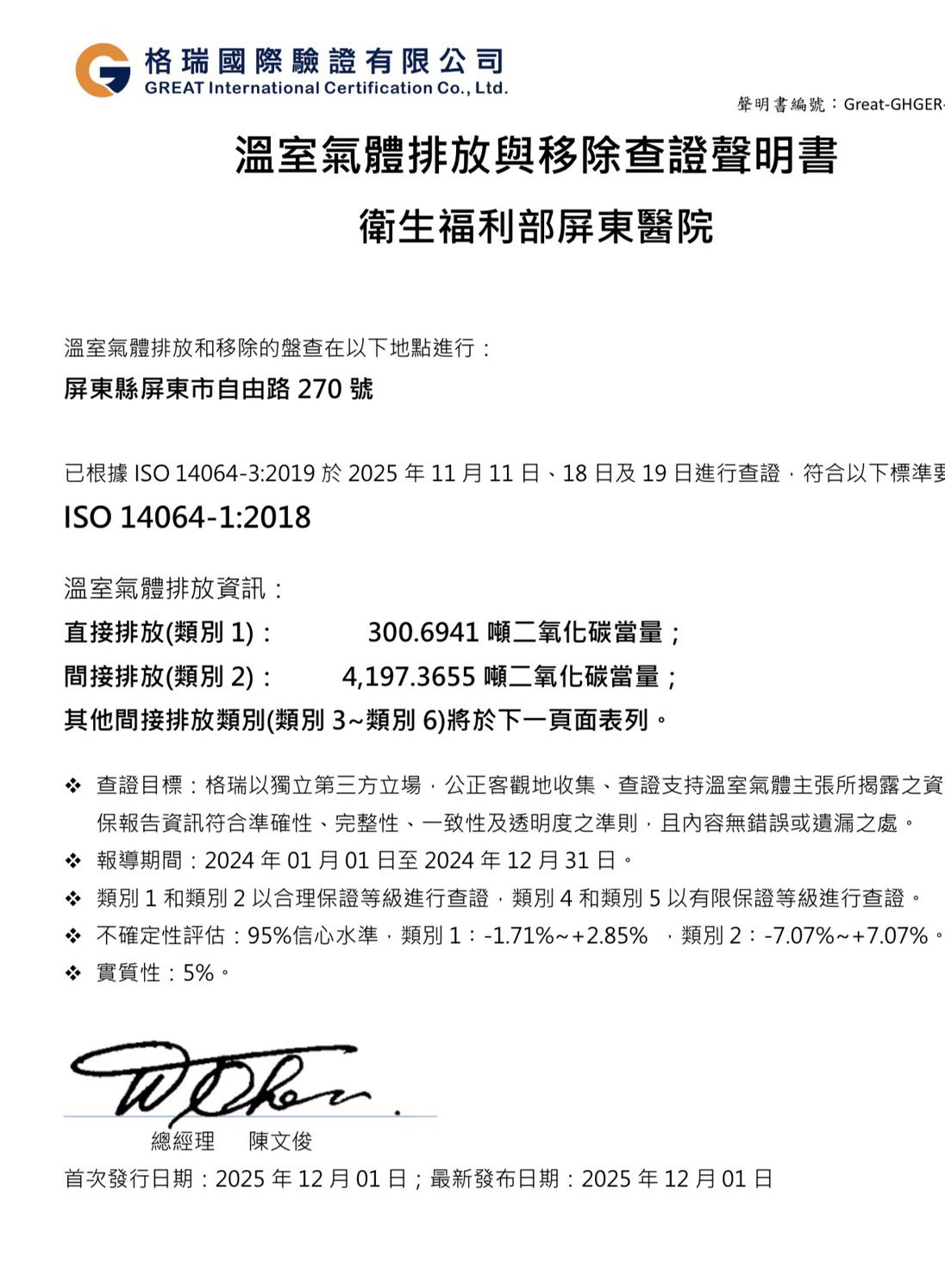 為落實減碳承諾,屏東醫院依循 ISO 14064-1 標準,完整建置溫室氣體盤查流程,涵蓋醫院建物、設備運作、冷鏈系統與相關直接或間接排放來源。透過嚴謹的資料蒐集、分析與盤查,醫院得以精準掌握碳排結構,作為未來擬定減碳策略與碳管理政策的重要基礎。此舉不僅符合國際趨勢,更為醫院未來參與淨零轉型奠定扎實根基。