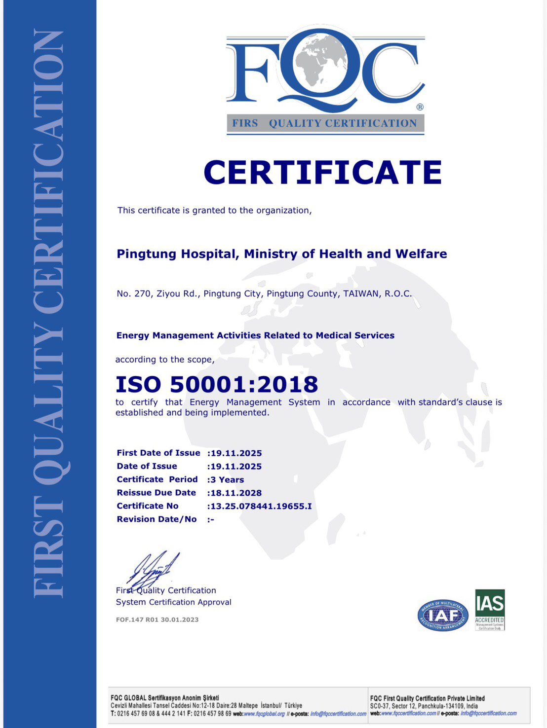 屏東醫院長期致力於提升能源效率,從空調系統改善、節能照明汰換、醫療設備耗能監測,到組成跨部門節能管理團隊,全面盤點能耗並持續執行改善計畫。在取得 ISO 50001 認證的過程中,醫院以科學化、制度化方式管理能源,並以數據為依據制定節能策略,成功提升能源使用效益,達到降低耗能、提升設備效能的目標。
