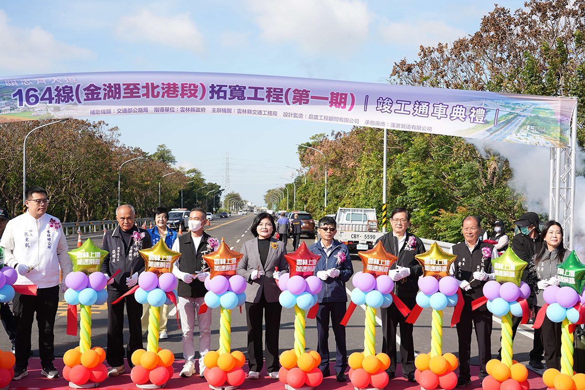 「縣道164線第一期拓寬工程」今(8)日舉行竣工典禮。由縣長張麗善主持,縣政總顧問張清良、立委丁學忠、公路局雲嘉南養護工程分局局長郭清水、議員黃文祥、北港鎮長蕭美文、水林代理鄉長張東凱,及北港、水林、口湖等鄉鎮村里長、代表出席,慶祝這項重大交通工程成果。道路拓寛工程完工後,打通大北港區東西向交通瓶頸,推動地方經濟發展;縣府會加緊推動二、三期工程,進一步整合海線觀光與工商業運輸。