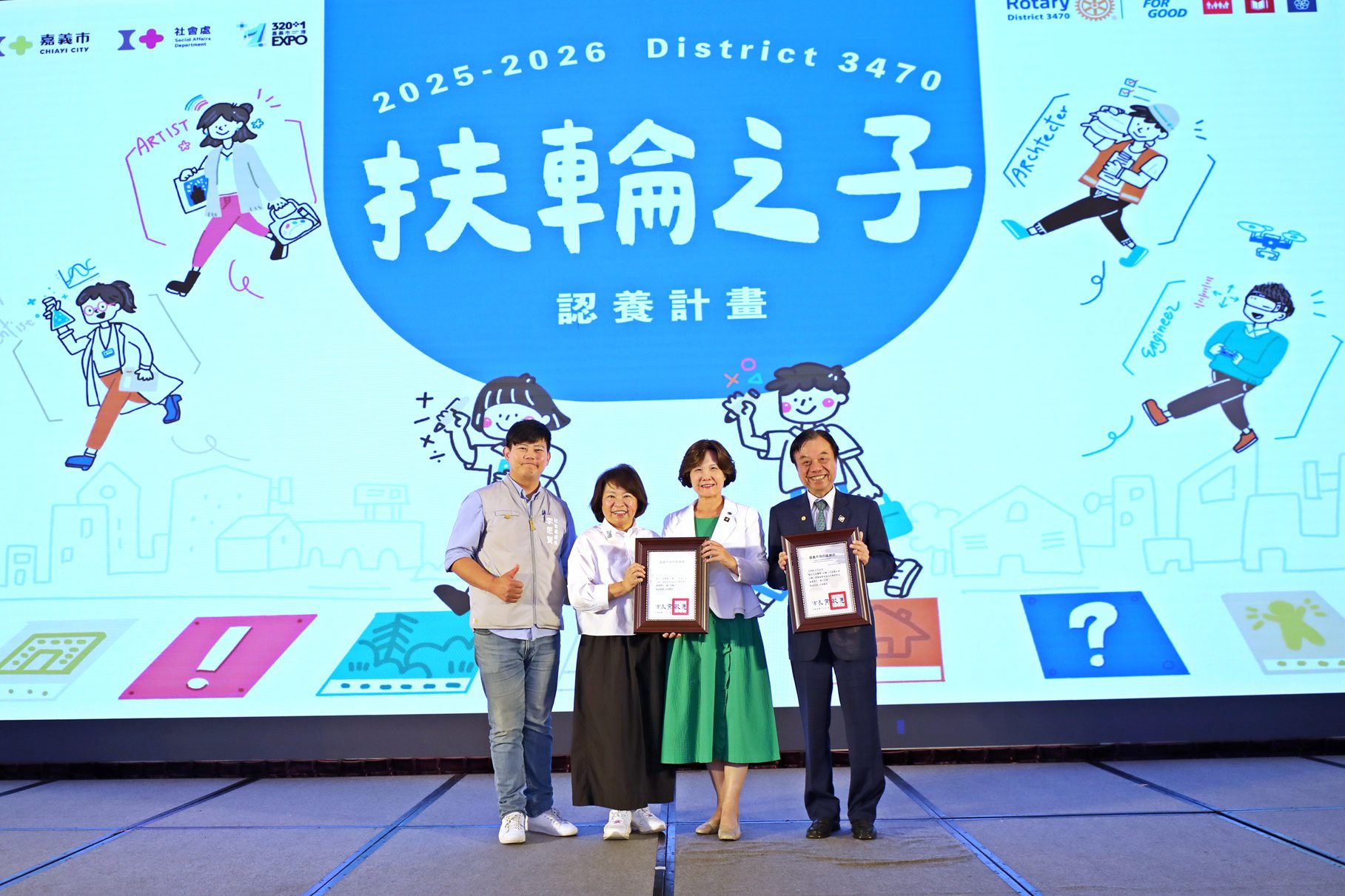 秉持照顧在地弱勢兒少理念,國際扶輪3470地區第三度攜手嘉義市政府推動「扶輪之子認養計畫」。今(8)日於耐斯王子大飯店舉辦捐贈儀式記者會,市長黃敏惠致贈感謝狀,感謝嘉義市18個扶輪社的熱烈響應,與市府團隊攜手傳遞關懷與溫暖。今年由莊和達先生擔任國際扶輪3470地區2025-2026年度總監,在其號召下,合計認養本市321位弱勢兒少,每名兒少獲得新臺幣1萬2千元獎助學金。除提供獎助學金外,扶輪社亦延續辦理「天籟列車」計畫,提供聽障者免費助聽器以及連結本市天后宮資源發放210份的贊普品物資給弱勢家戶;此外,今年市府也特別感謝嘉麥皮鞋加碼辦理「溫暖贈鞋活動」,提供300張鞋券予弱勢兒少,讓小朋友穿新鞋、迎希望。
