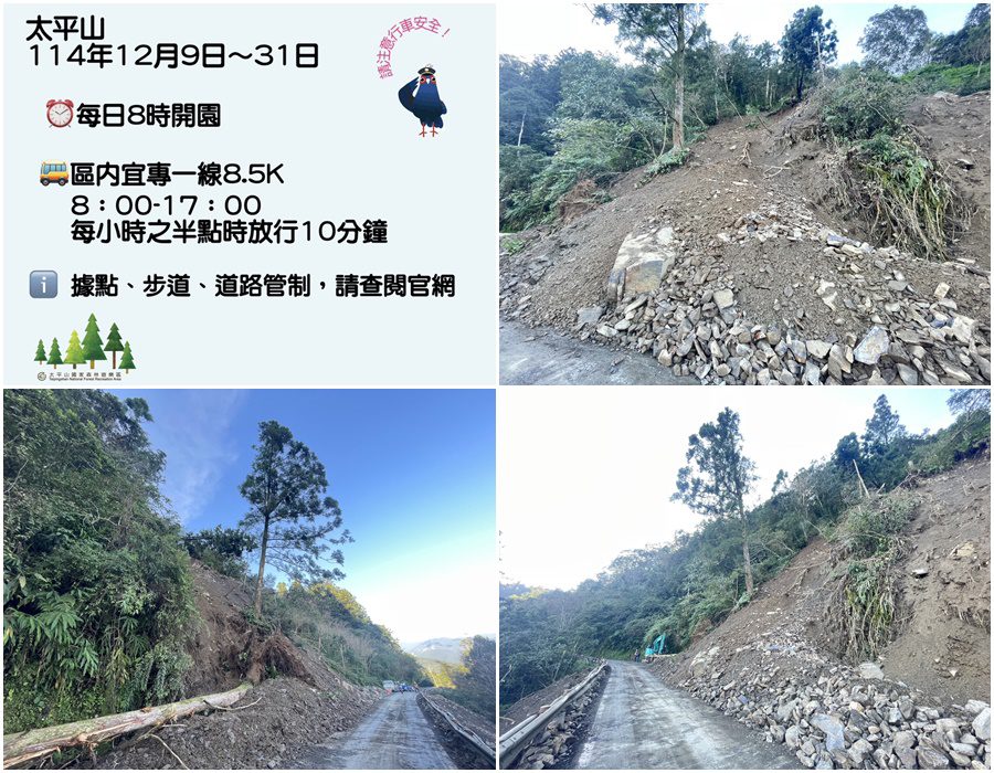 太平山國家森林遊樂區宜專一線8.5公里處,近日接連發生坍方阻斷交通災情,雖經全力搶修恢復單線雙向通車,但因考量邊坡仍然不穩定,為了確保行車及遊憩安全,特別調整開園時間及交通管制因應措施,從12月9日至31日,每日8點至17點每半小時放行10分鐘,亦即每小時的30分如8:30、9:30….開放通行10分鐘;開園時間不論平假日,調整為每日8時。