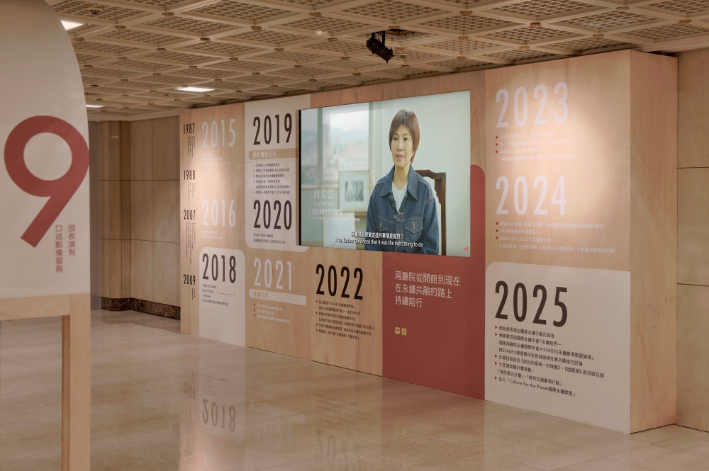 以兩廳院典藏的文物作為切入點,將永續理念轉化為可親近的日常故事。其中展出的「佛式聚光燈」,其象徵著兩廳院透過更換老舊高耗能系統,自1987年場館啟用至2024年間累積節省了1,150萬度電,相當於兩廳院一整年的全館用電。現場亦展示開館至今六個不同年代的紙本票券,並以數據化的方式呈現票券電子化後的減紙成果,省下的用紙可舖滿 25 座藝文廣場,讓永續從數字變成可被感受的故事。