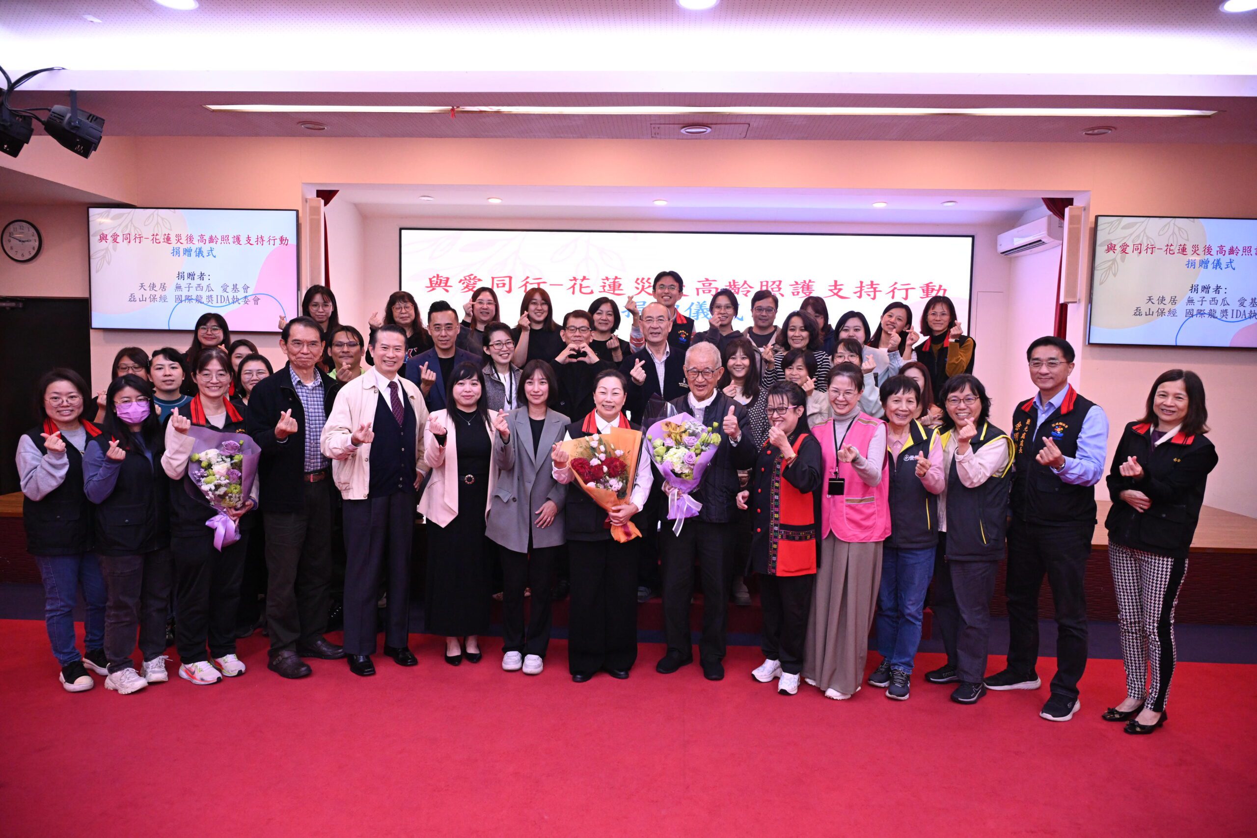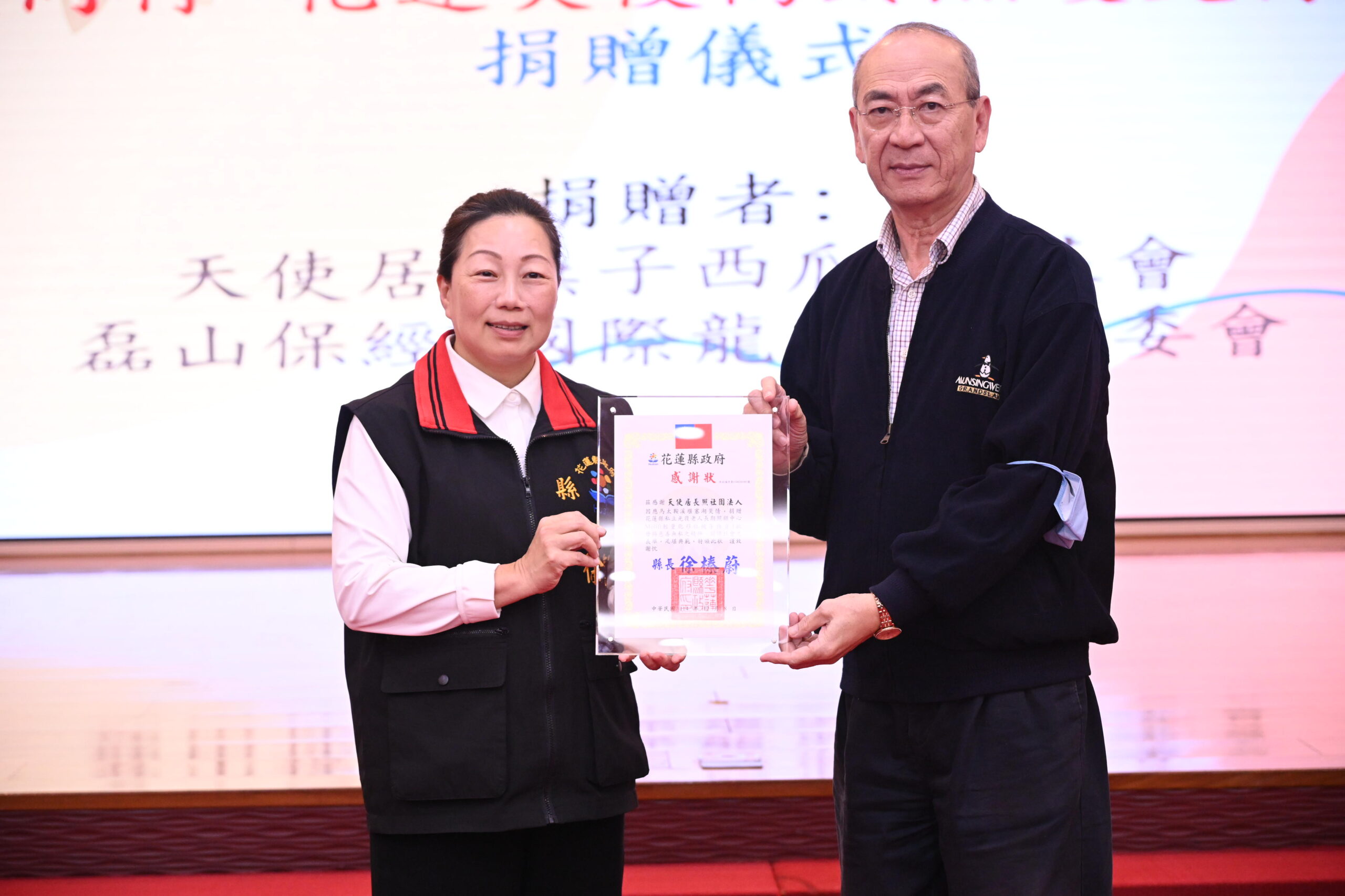 0923馬太鞍溪堰塞湖潰壩重創光復鄉,為協助災後長照機構重建,前監察院長王建煊率其創辦的無子西瓜社福基金會、天使居長照法人及愛心第二春文教基金會代表等,今(9)日捐助光復老人長期照顧中心與花蓮縣私立吉豐老人養護所,總值超過127萬元的照護設備與現金,由縣長徐榛蔚代表接受。