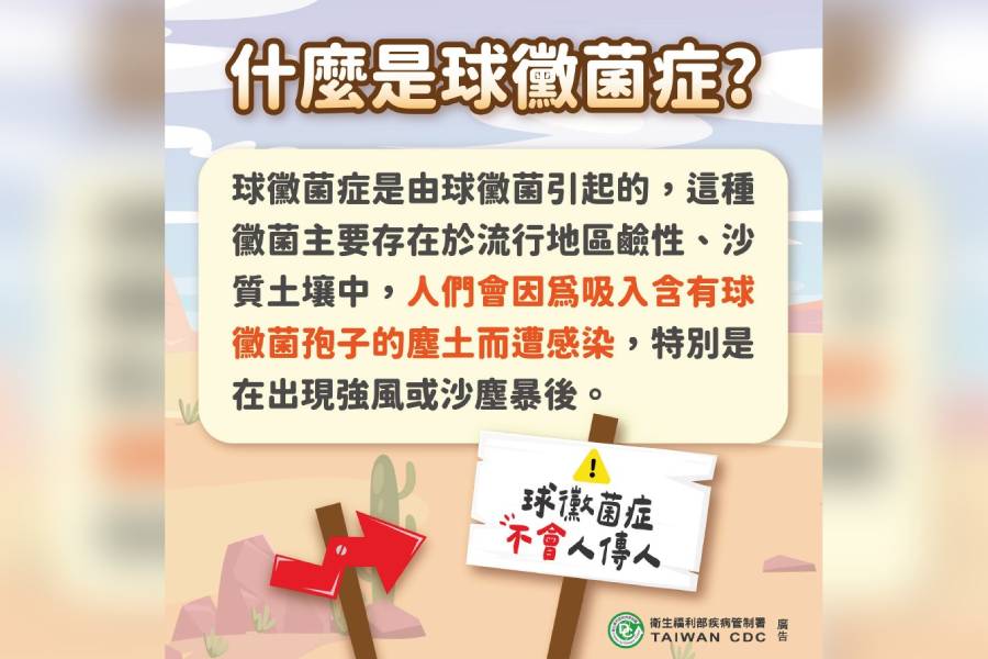 疾管署指出,球黴菌症為美國西南部、墨西哥、中南美洲之山谷及沙漠地區之流行病,存在於流行地區鹼性、沙質土壤中,主要透過吸入含球黴菌孢子之塵土而感染,特別是在發生強風或沙塵暴後,但不會在人與人之間造成傳染。