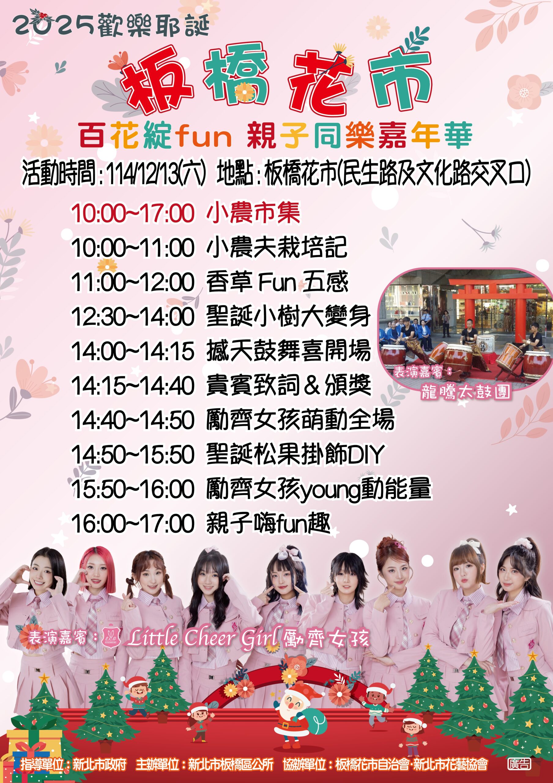 更多節目在花市,有親子趣味互動熊玩偶抱回家、龍騰太鼓團及人氣女團勵齊女孩等精彩演出,板橋花市及板橋公所粉絲團按讚可參加集章闖關活動,誠摯邀請市民朋友於12月13日一同走進板橋花市,在花香、音樂與節慶氛圍中,迎接溫暖幸福的 2025 歡樂耶誕。