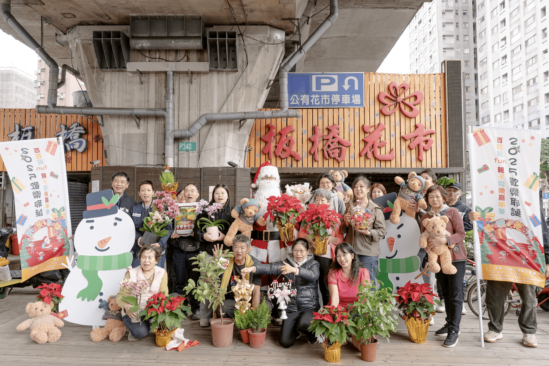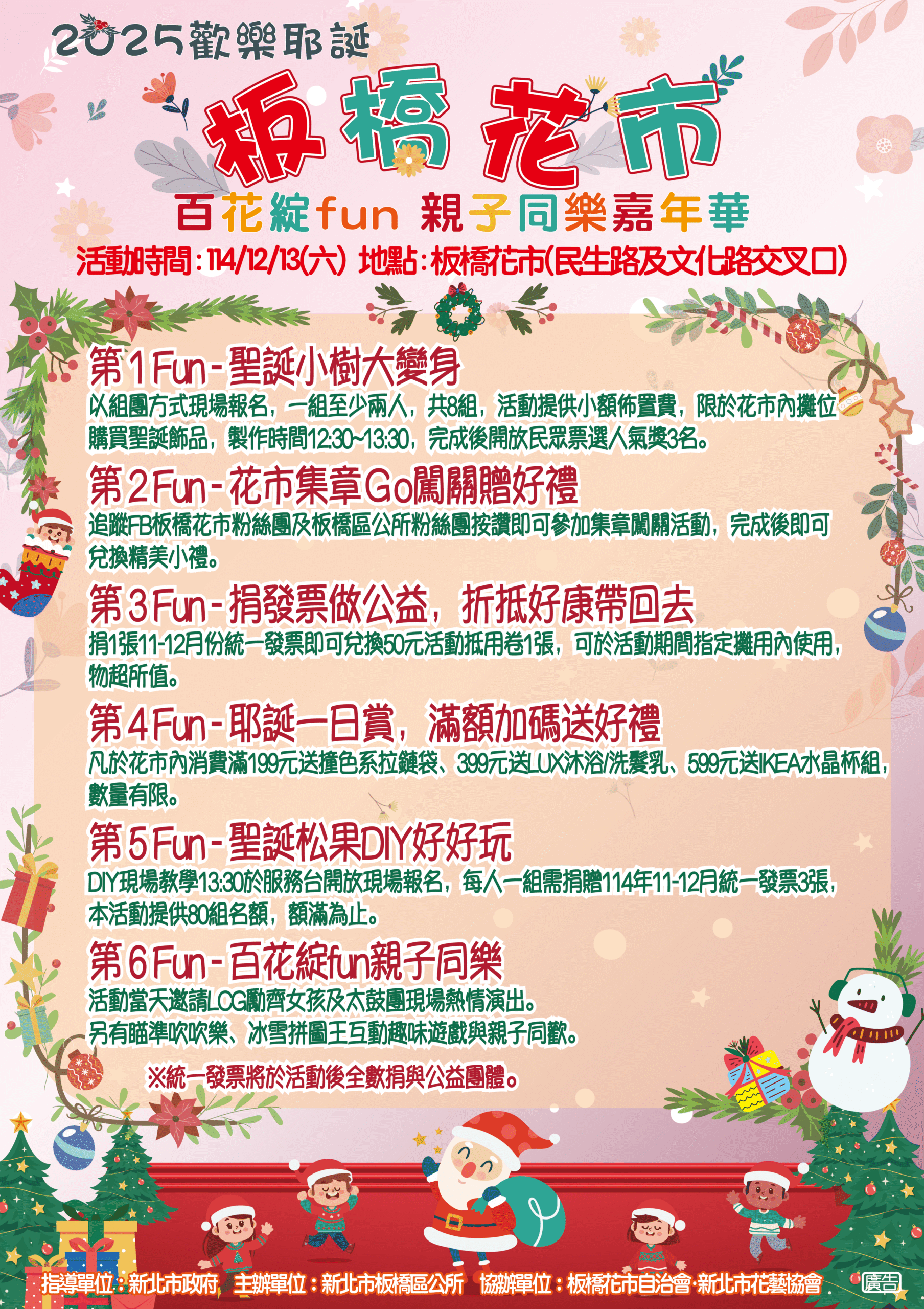 為迎接充滿溫馨的耶誕節,板橋區公所於114年12月13日(六) 12點分至17時在板橋花市舉辦「2025歡樂耶誕 板橋花市百花綻Fun 親子同樂嘉年華」熱鬧登場,活動內容有聖誕限定DIY、聖誕小樹佈置競賽、滿額贈活動、花市集章Go闖關集好禮、活動抵用券、親子趣味競賽及舞台表演等豐富內容,邀請市民在花卉芬芳與節慶氛圍中,共享歡樂幸福的週末。
