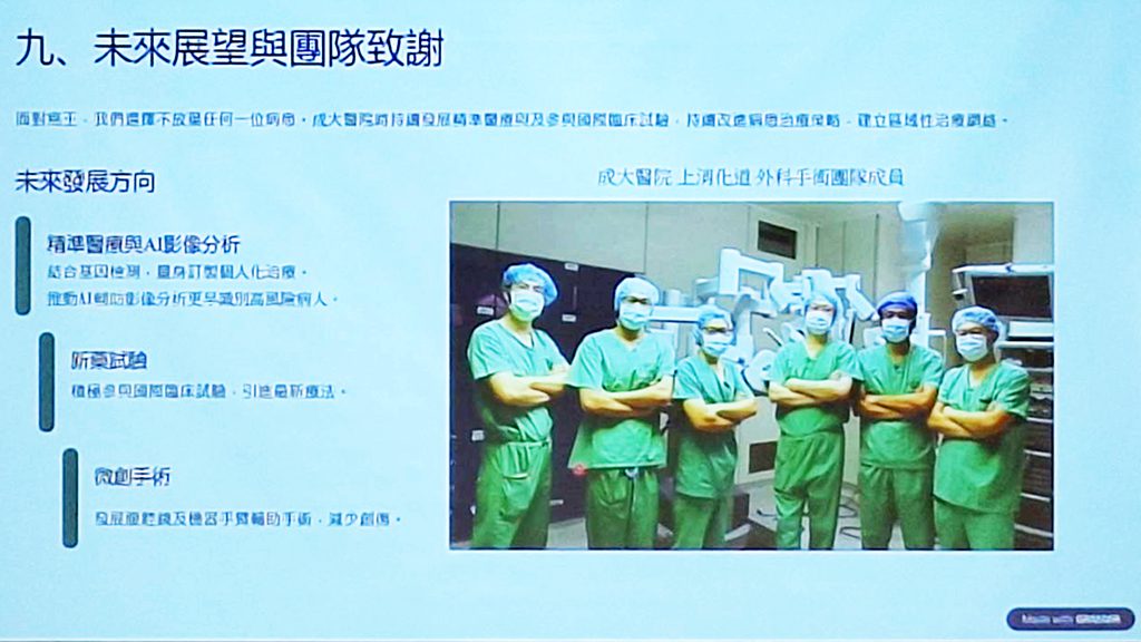 胰臟癌是否適合手術,並非僅由影像判斷,而是需由具經驗的團隊整合評估腫瘤生物特性與病人整體狀況,做出適切安排。廖亭凱醫師表示,「我以一年多時間,回顧分析400多位病人的影像與預後,發現胰臟癌實際侵犯的程度,往往超出影像可偵測的界限。」成大醫院團隊在胰臟癌治療領域長期深耕,展現國際級的醫療實力。團隊將持續推動AI輔助影像分析與個別化治療規劃,期望更早辨識高風險病人、提高可切除率,為病人創造更佳的治療成效。