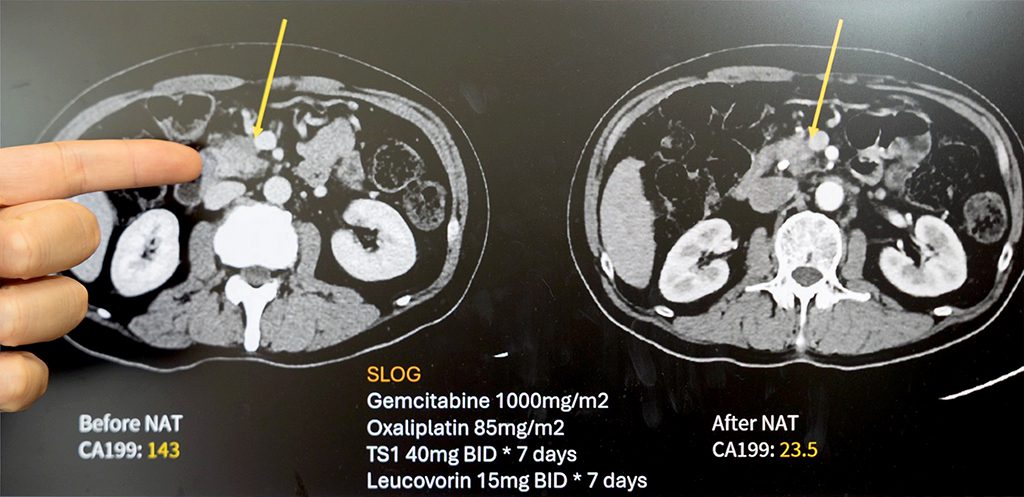 【記者吳玉惠/臺南報導】 62歲的王先生出現體重減輕與黃疸症狀,經檢查確診為胰臟癌。影像顯示腫瘤已侵犯門靜脈,屬於「邊界可切除」階段。過去此類病人往往難以直接接受手術,預後也較差。經成大醫院外科團隊多專科評估後,王先生接受「術前化學治療(Neoadjuvant Chemotherapy, NAC)」合併「擴大胰臟切除手術(Extended Pancreatectomy, EP)」。歷經四個月化療,腫瘤明顯縮小,順利完成合併血管重建的胰十二指腸切除術。術後追蹤兩年,病人恢復良好、生活如常。