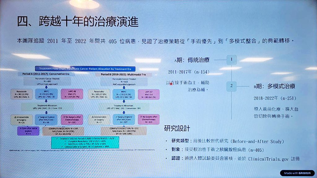 成大醫院一般外科廖亭凱醫師指出,胰臟癌是極具挑戰性的惡性腫瘤之一,多數病人確診時已屬局部晚期或轉移期,無法直接手術。在沈延盛教授領導下,成大團隊積極導入「術前化療」結合「擴大切除」的整合治療策略,讓原本無法手術的病人有更多機會,也明顯延長整體存活期。